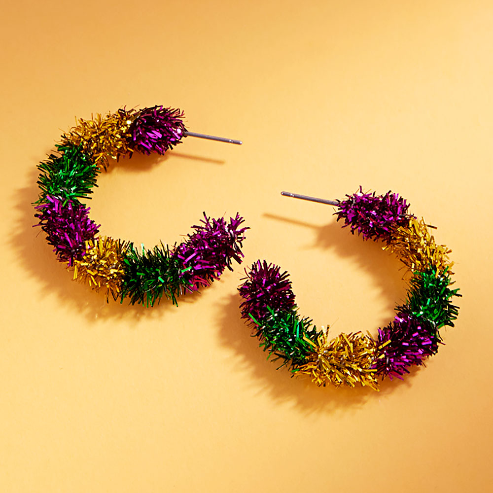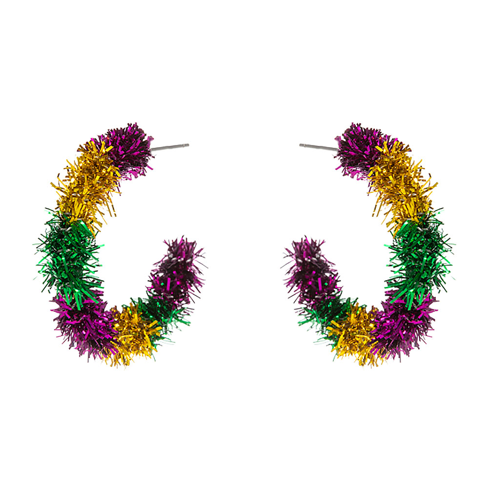 Details • Size : 1.4" X 1.4" • Titanium Post Back • Make a sparkling statement with these festive tinsel hoop earrings designed to add fun and flair to any celebration. Lightweight and eye-catching, they’re perfect for parties, parades, and special occasions, bringing a playful and glamorous finish to your look. • Lead and Nickel Compliant • Hypoallergenic