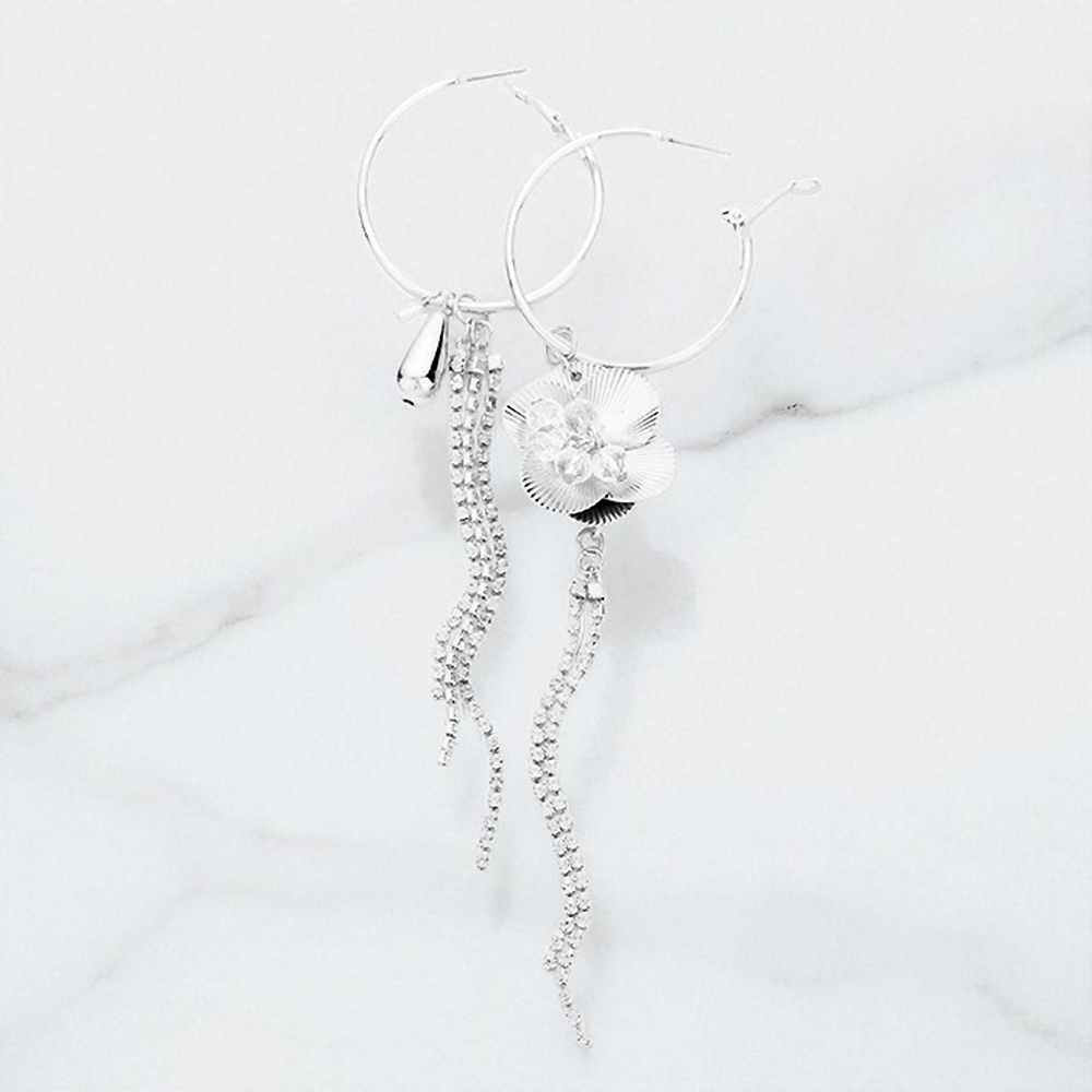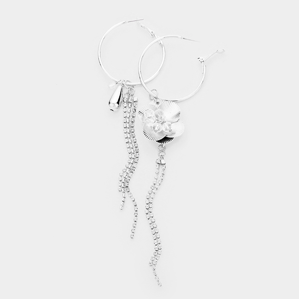 Metal Flower Rhinestone Pave Tassel Hoop Earrings