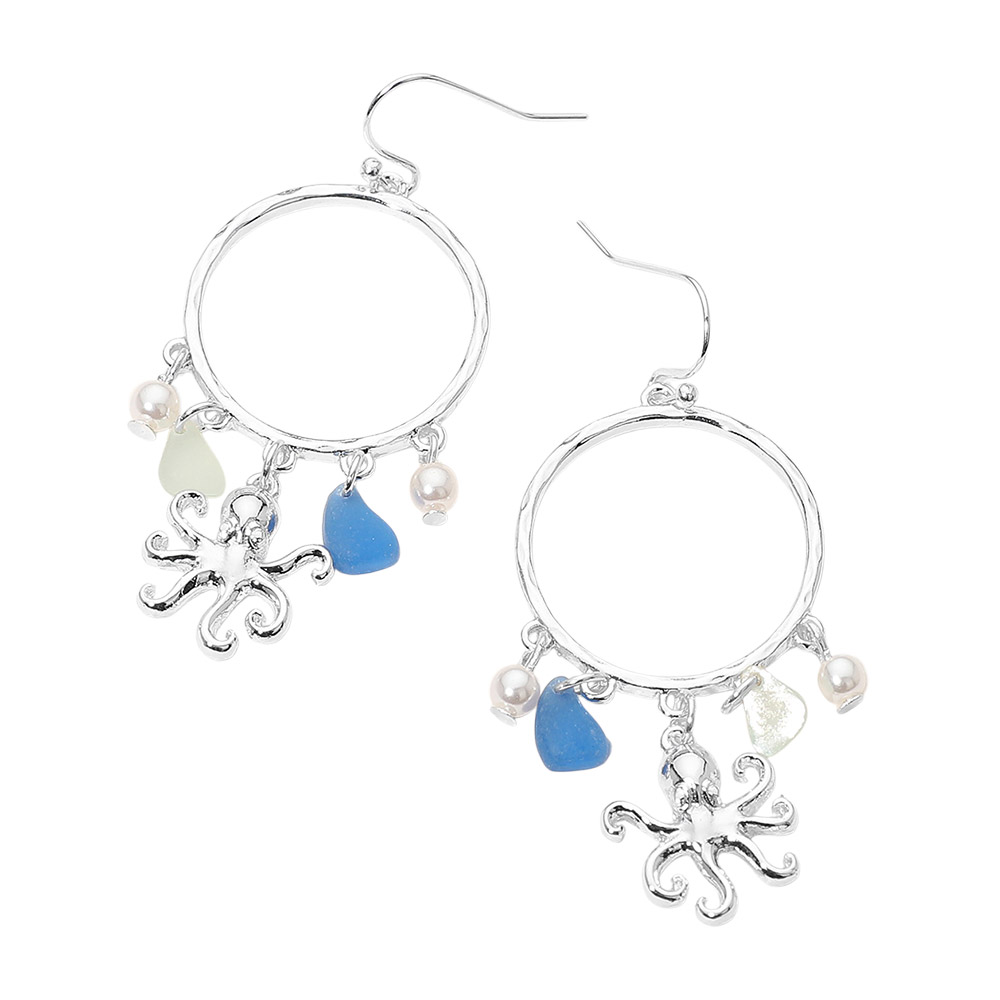 Octopus Sea Glass Charm Drop Open Ring Dangle Earrings