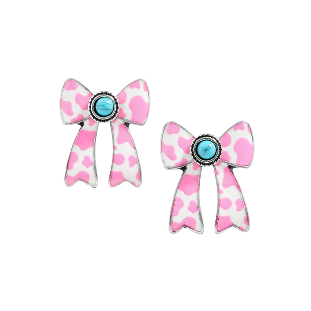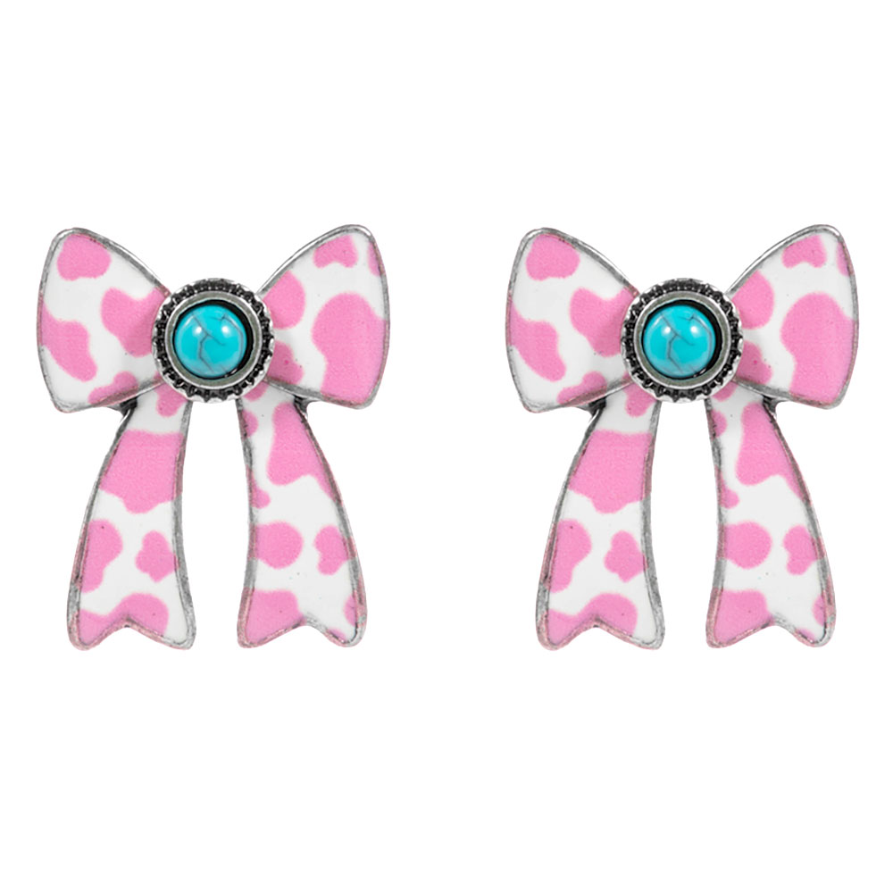 Oval Turquoise Stone Center Animal Pattern Print Western Bow Earrings