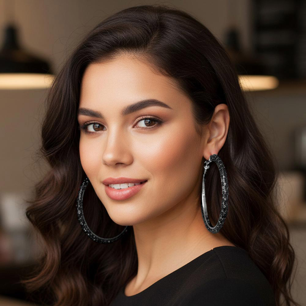 • Make a bold statement with these large hoop earrings featuring a sleek textured accent that adds depth and shine. Perfect for elevating both casual and evening outfits, their lightweight yet durable design ensures all-day comfort and timeless sophistication.