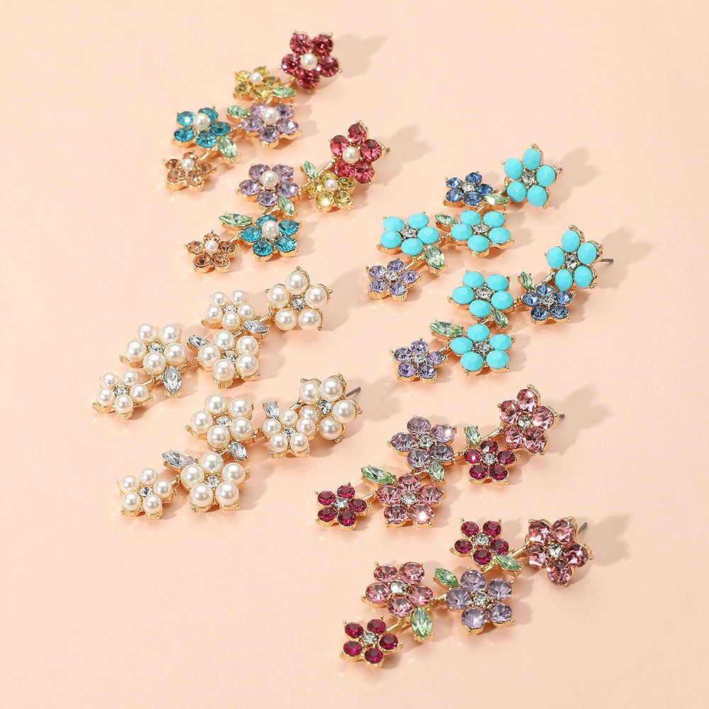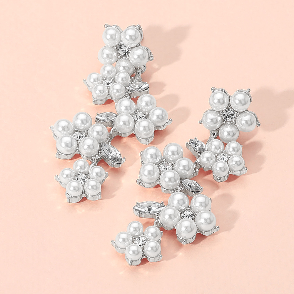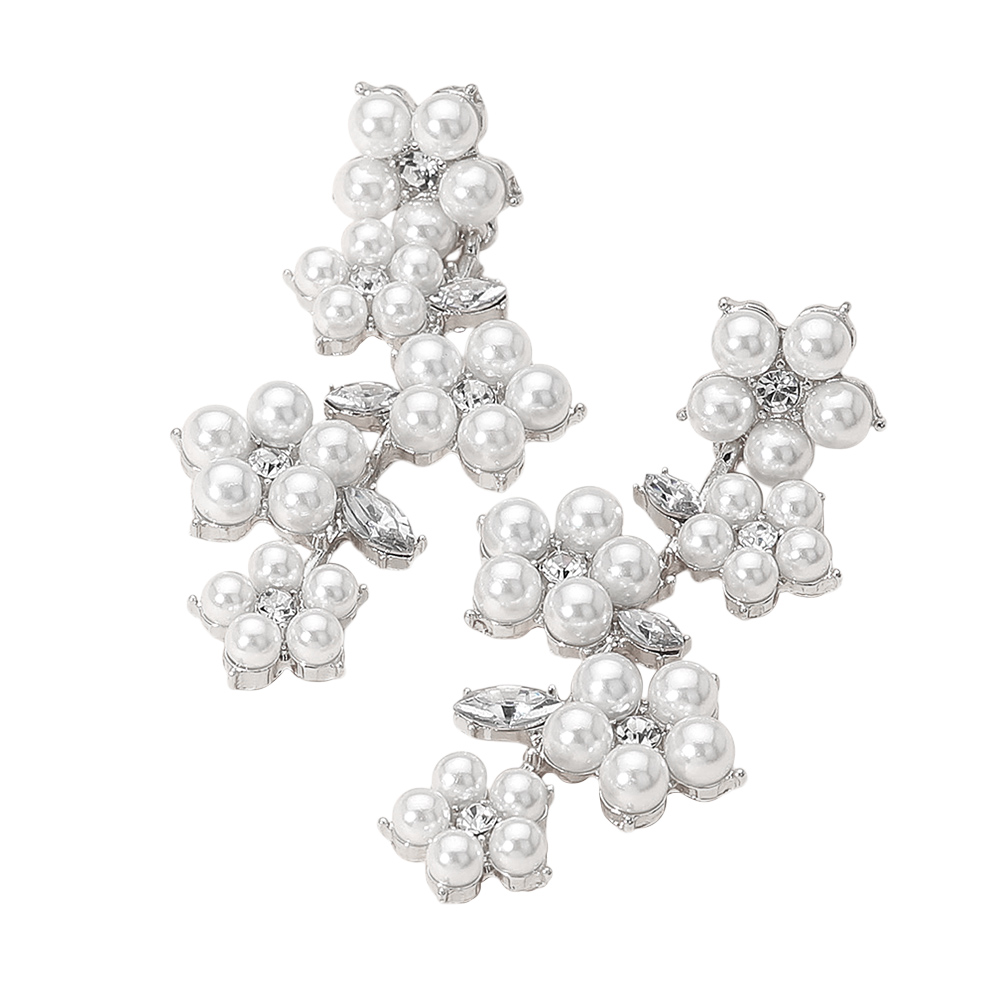 Details • Size : 1" X 2.5" • Post Back • Stunning floral drop earrings featuring clustered pearl bead accents and sparkling crystals. Designed with cascading blooms for a graceful, eye-catching look, perfect for weddings, parties, or special occasions. • Lead and Nickel Compliant