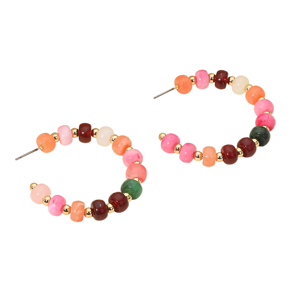 Details • Size : 2" X 2" • Post Back • Stylish beaded hoop earrings featuring glossy resin beads and gold-tone accents. Lightweight and comfortable for daily wear, these trendy hoops add a warm, modern touch to any outfit. Perfect for casual looks or gifting. • Lead and Nickel Compliant