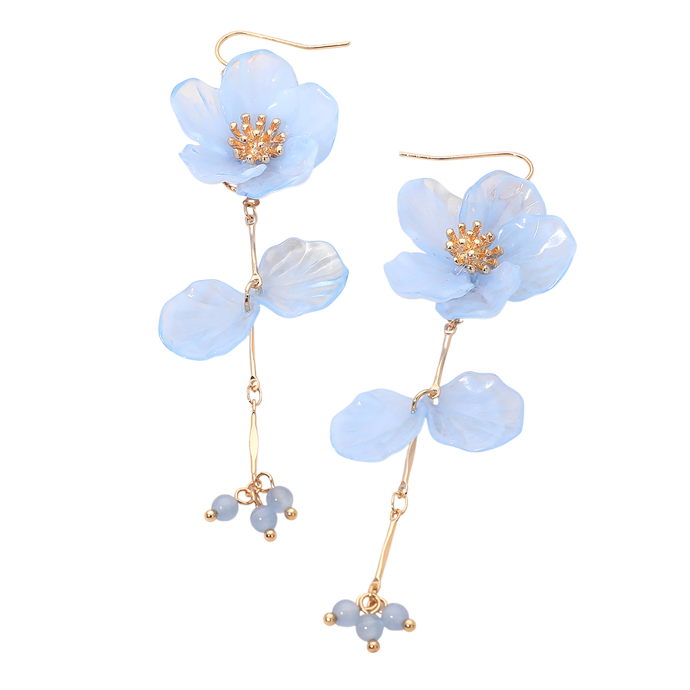 Details • Size : 1.25" X 3.75" • Fish Hook Back • Elegant long drop earrings featuring layered floral petals and delicate clustered accents for a soft, romantic look. Perfect for weddings, parties, garden events or adding graceful botanical charm to everyday style with their airy, feminine movement. • Lead and Nickel Compliant