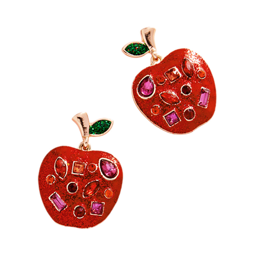 Details • Size : 1" X 1.25" • Titanium Post Back • Whimsical apple-shaped drop earrings featuring faceted accents for eye-catching sparkle. Lightweight and playful, they add a fun statement to casual outfits, party looks, themed events, or gifting moments while staying comfortable for all-day wear. • Hypoallergenic • Lead and Nickel Compliant
