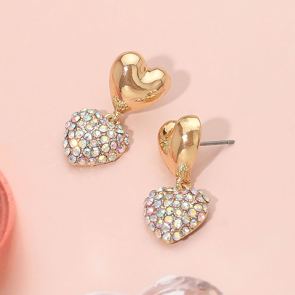 Details • Size : 0.5" X 1.2" • Post Back • Add a touch of romance with these sparkling double heart earrings, featuring a sleek metallic top heart and a dazzling crystal-accented lower heart. Perfect for day-to-night wear, they bring elegant charm and a playful shimmer to your style effortlessly. • Lead and Nickel Compliant