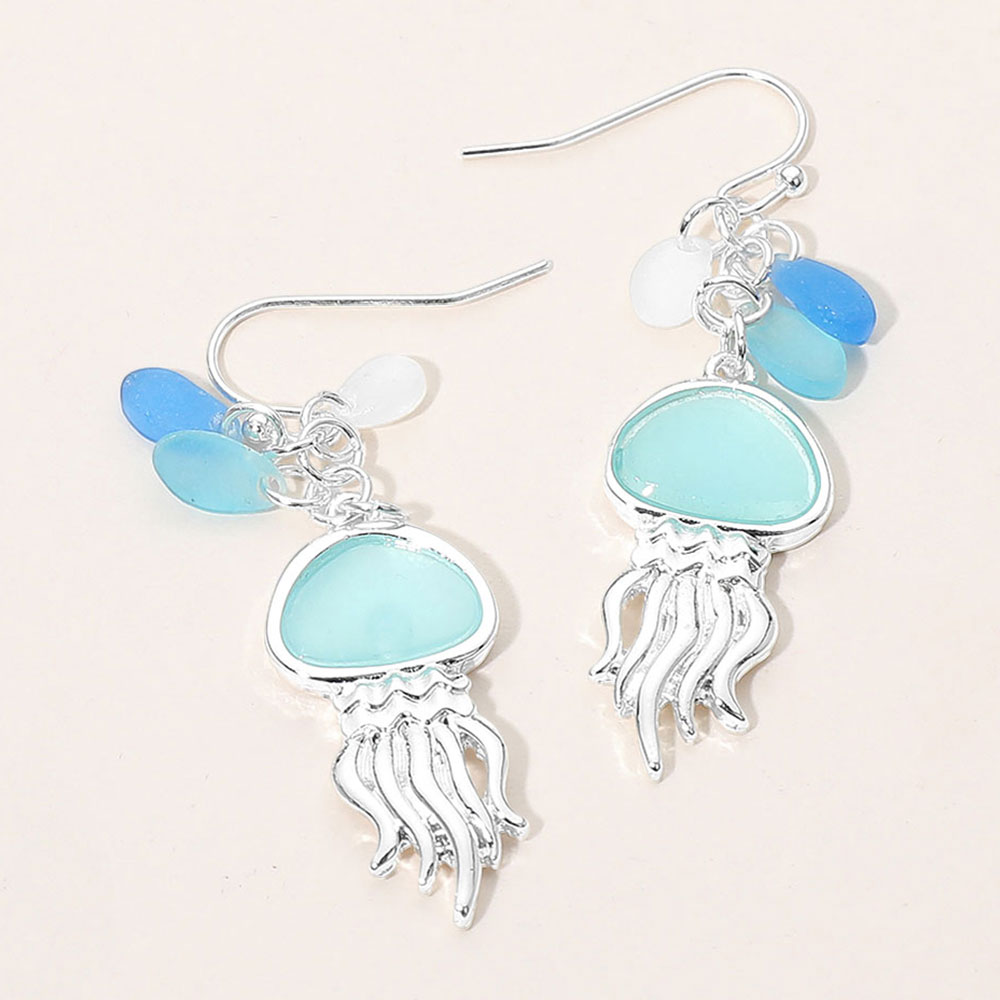 Details • Size : 0.6" X 2" • Fish Hook Back • Jellyfish dangle earrings featuring a playful ocean inspired silhouette with flowing charm details that add movement and visual interest. A fun novelty style ideal for summer collections, beach boutiques, resort gift shops, and coastal themed assortments, perfect for customers drawn to whimsical sea life designs. • Lead and Nickel Compliant