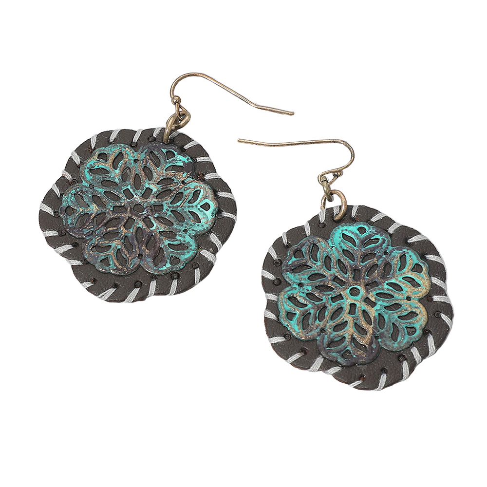 Stitched Faux Leather Layered Metal Floral Dangle Earrings