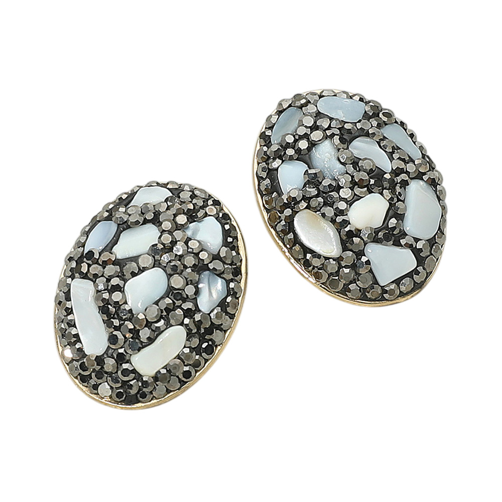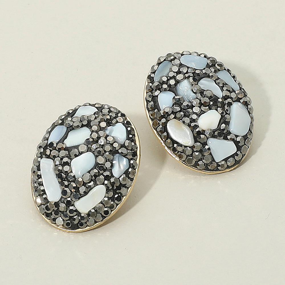Details • Size : 0.8" X 1.2" • Post Back • Stylish oval stud earrings featuring a mosaic stone design accented with sparkling details. Lightweight and versatile, these earrings add a chic statement to any outfit. Perfect for casual wear, evening looks, or gifting, they bring a unique blend of elegance and modern charm to your accessory collection. • Lead and Nickel Compliant