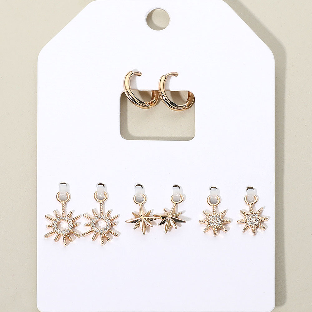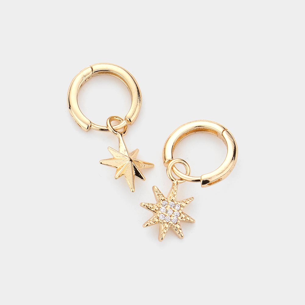 Details • Size : 0.7" L, 0.5" L • Huggie Back • Versatile earring set with sleek hoops and detachable star-themed charms in radiant designs. Mix and match these cosmic-inspired pieces to express your unique style with a touch of elegance. • Lead and Nickel Compliant