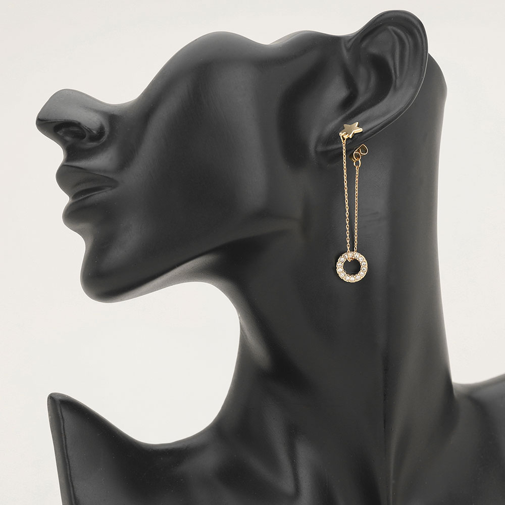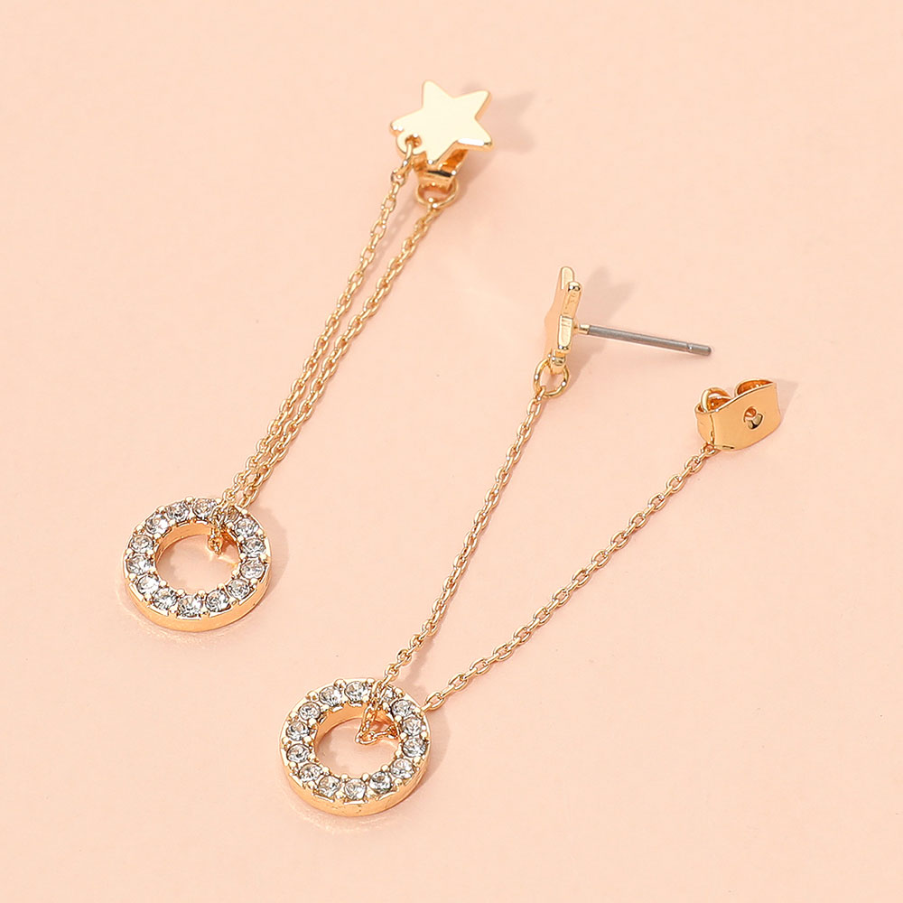Details • Size : 0.4" X 2.1" • Post Back • Dainty chain drop earrings featuring a star stud paired with a sparkling open halo charm for graceful movement and subtle shine. Designed to elevate everyday looks or complement evening wear with an effortlessly elegant, lightweight statement that adds modern charm. • Lead and Nickel Compliant