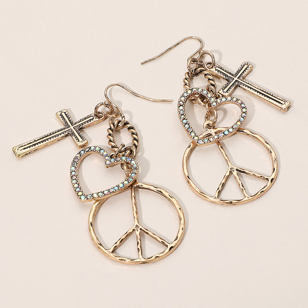 • Express your free spirit with these boho earrings featuring peace signs, hearts, and crosses. A playful mix of symbolic charm, perfect for everyday style or festival wear.