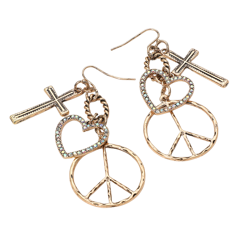 Stone Paved Open Heart Metal Cross Peace Dangle Earrings