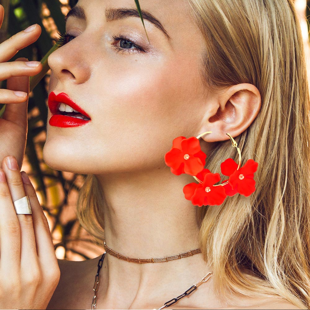 • Eye-catching floral hoop statement earrings designed with layered petal accents arranged along a circular silhouette. A bold yet feminine accessory that adds movement and personality to everyday outfits, vacation looks, seasonal collections, and boutique assortments seeking playful, fashion-forward statement jewelry.