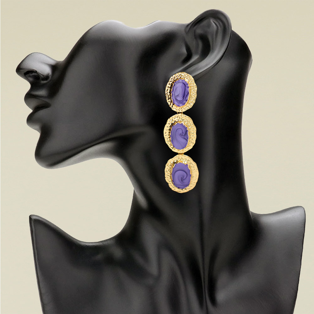 Details • Size : 0.75" X 3.25" • Post Back • Stylish triple oval drop earrings featuring marbled oval centers framed by textured metallic borders. The cascading design adds a touch of modern elegance, perfect for dressing up any outfit. Lightweight yet striking, ideal for parties, special events, or chic everyday wear. • Lead and Nickel Compliant
