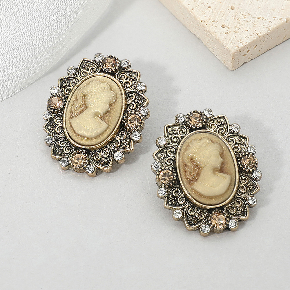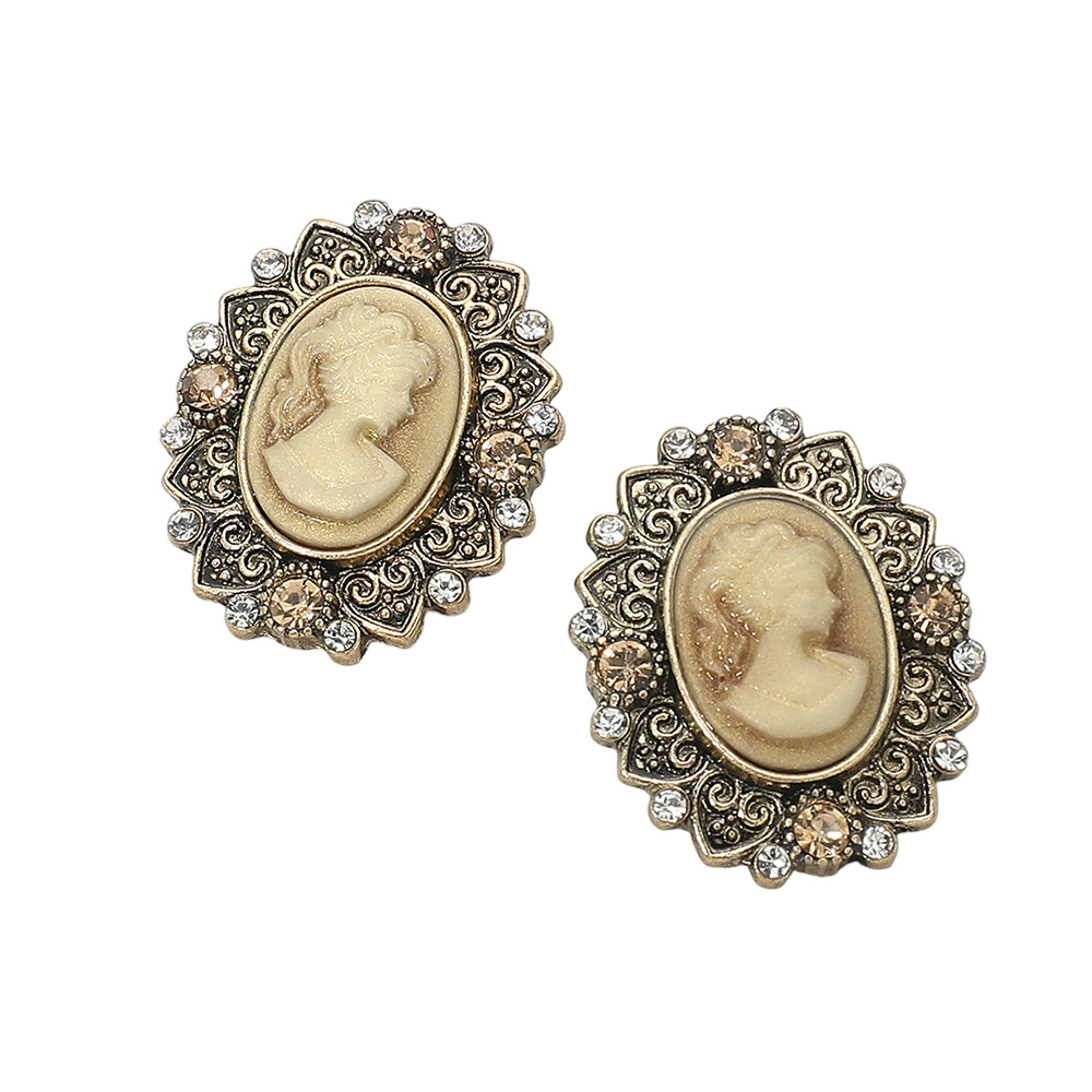 Details • Size : 1" X 1.25" • Post Back • Add a touch of timeless elegance with these vintage cameo oval stud earrings featuring an ornate frame and intricate detailing. Perfect for classic or formal looks, these earrings capture antique-inspired charm that complements both modern and traditional styles beautifully. • Lead and Nickel Compliant