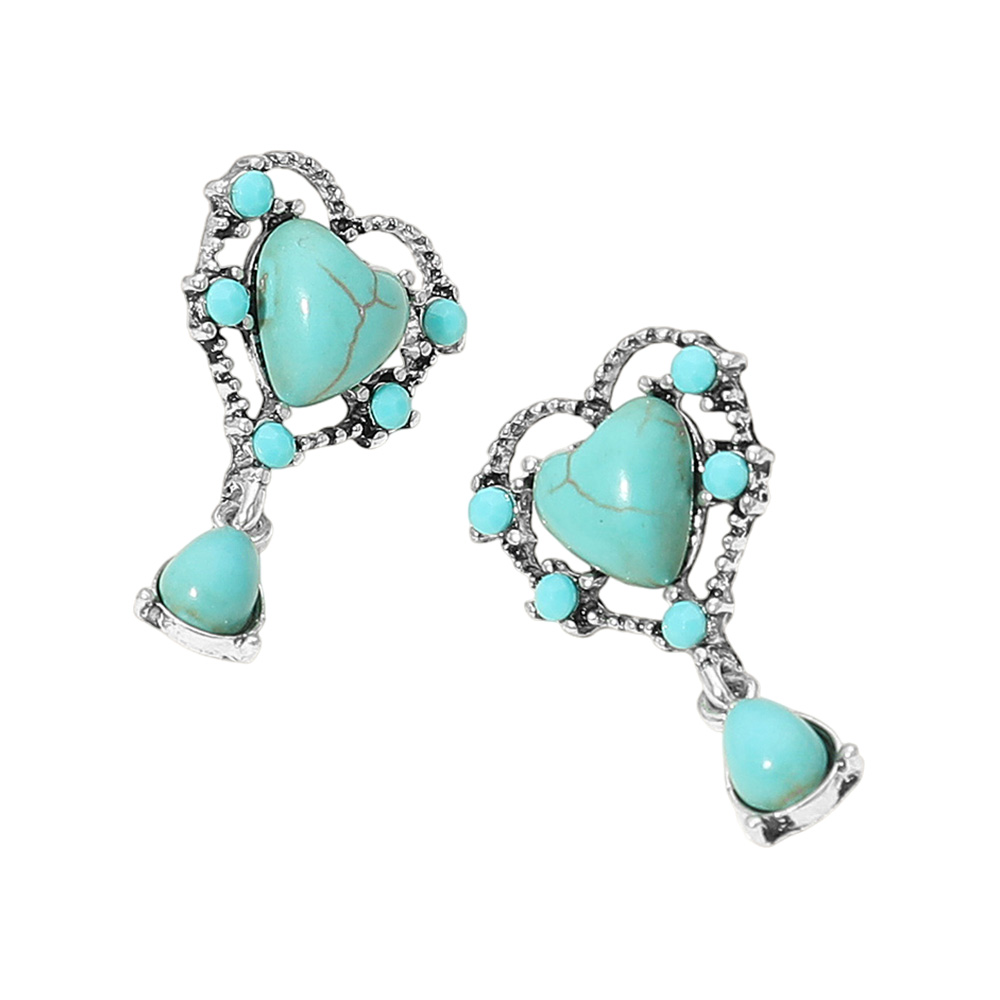 Details • Size : 0.7" X 1.25" • Post Back • Add a romantic Western touch to your look with these heart-shaped turquoise drop earrings. Featuring intricate detailing and vibrant turquoise stones, they blend elegance with boho charm. Perfect for dressing up casual outfits or adding a pop of color to your everyday style. • Lead and Nickel Compliant