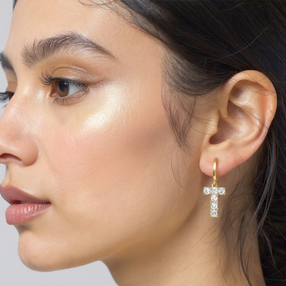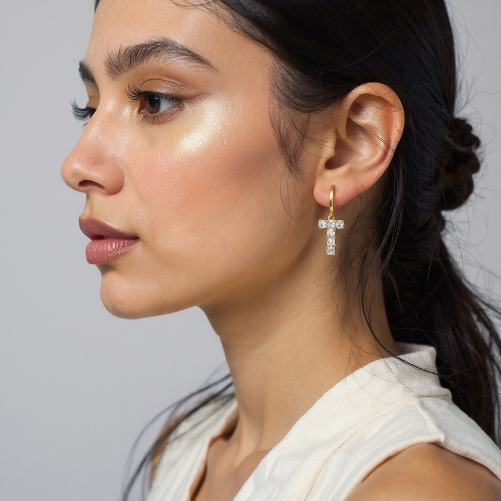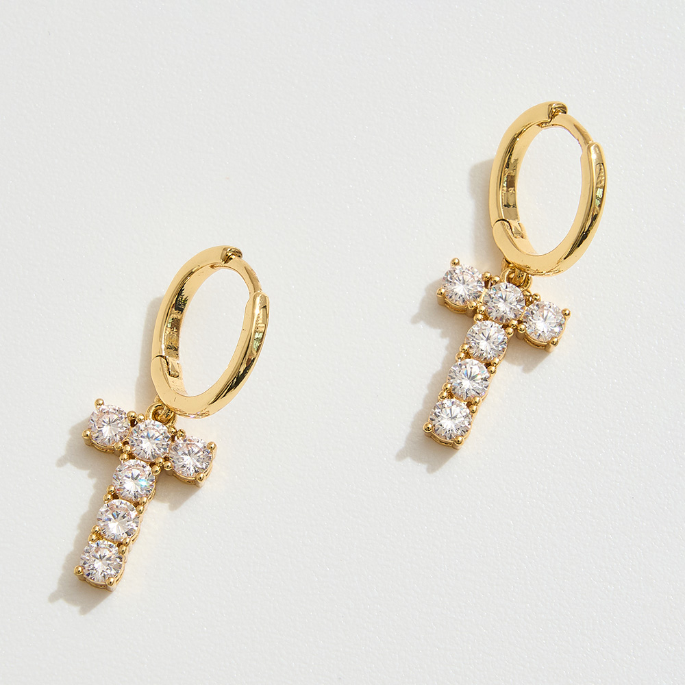 Details • Size : 0.4" X 1.1" • Huggie Back • These elegant hoop earrings showcase dazzling cubic zirconia stones arranged in a cross-shaped dangle, combining timeless symbolism with modern sophistication. Lightweight and versatile, they add a radiant touch to both casual and dressy outfits, making them a meaningful statement piece. • Brass • CZ Cubic Zirconia • Gold Dipped • Hypoallergenic • Lead and Nickel Compliant • Made In Korea