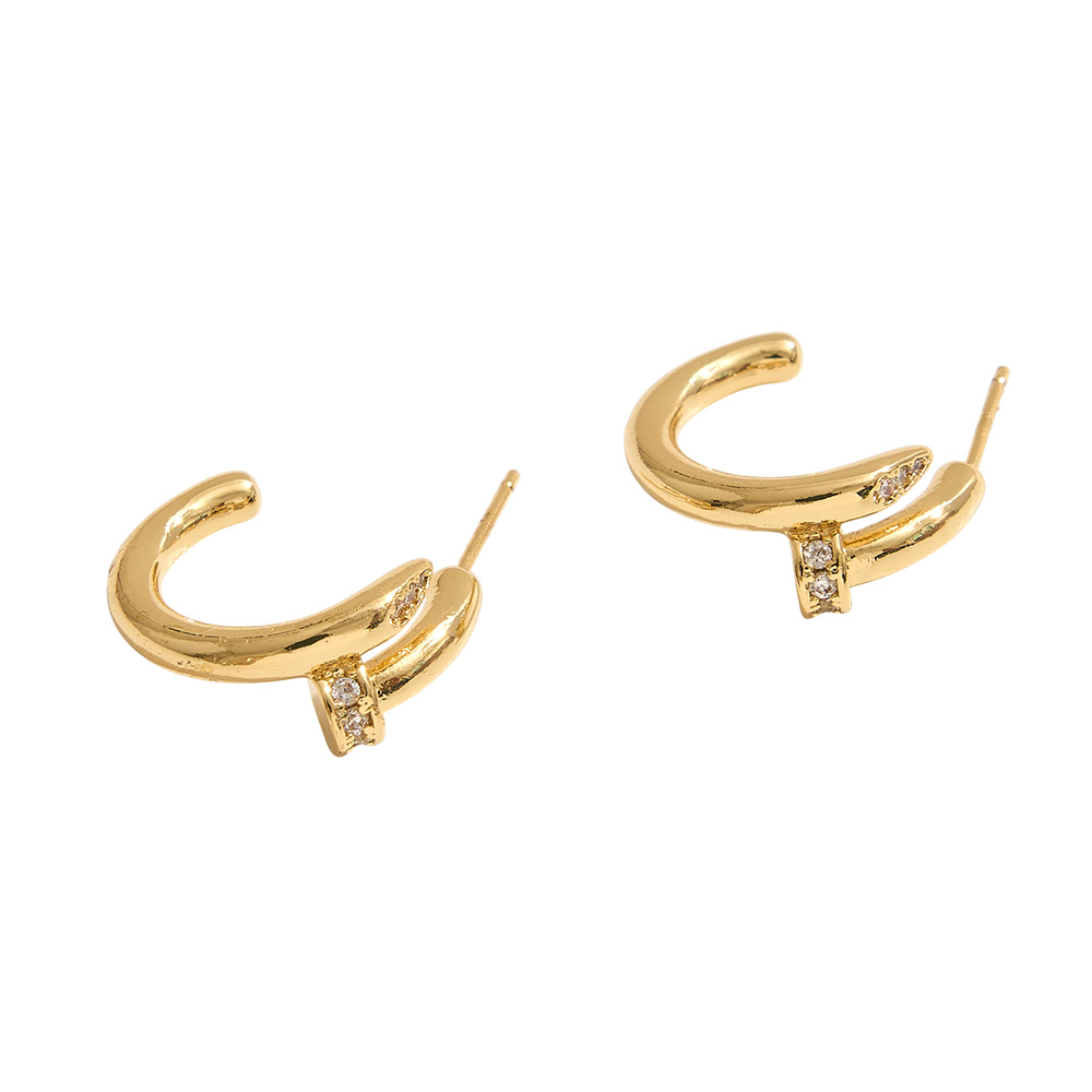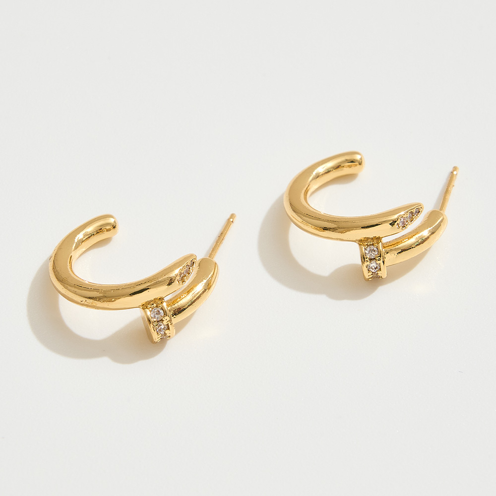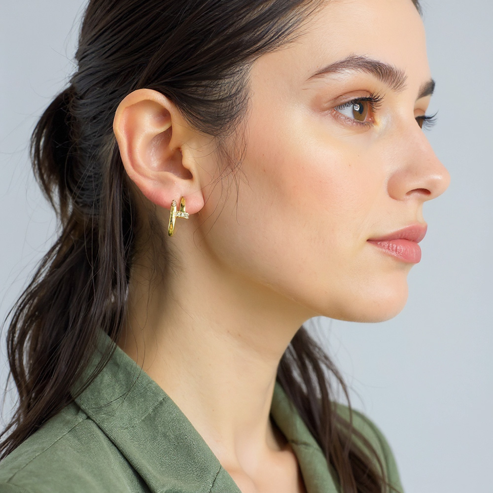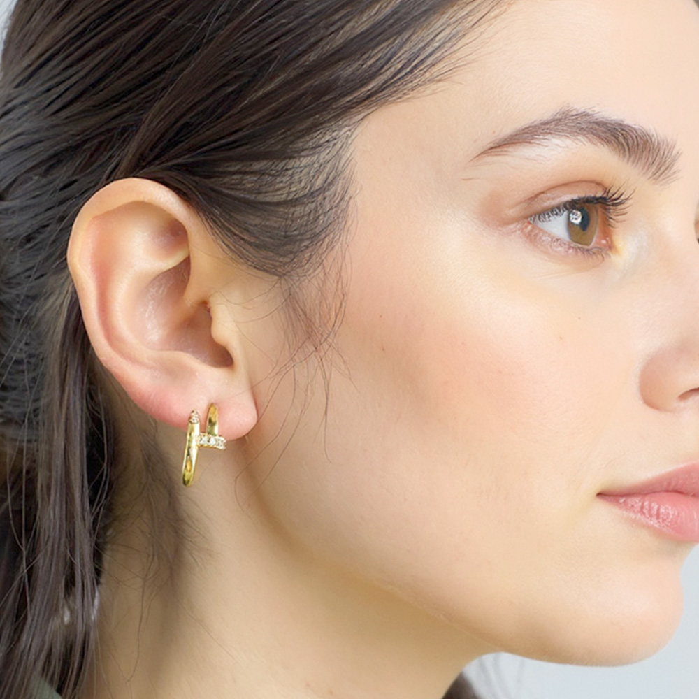 Details • Size : 0.8" X 0.75" X 0.3" • Post Back • Add a chic twist to your look with these curved hoop earrings featuring a sleek, fluid design accented by sparkling CZ stones. Their modern silhouette blends elegance and edge, making them a versatile piece for both casual wear and elevated occasions. • Brass • CZ Cubic Zirconia • Gold Dipped • Hypoallergenic • Lead and Nickel Compliant • Made In Korea