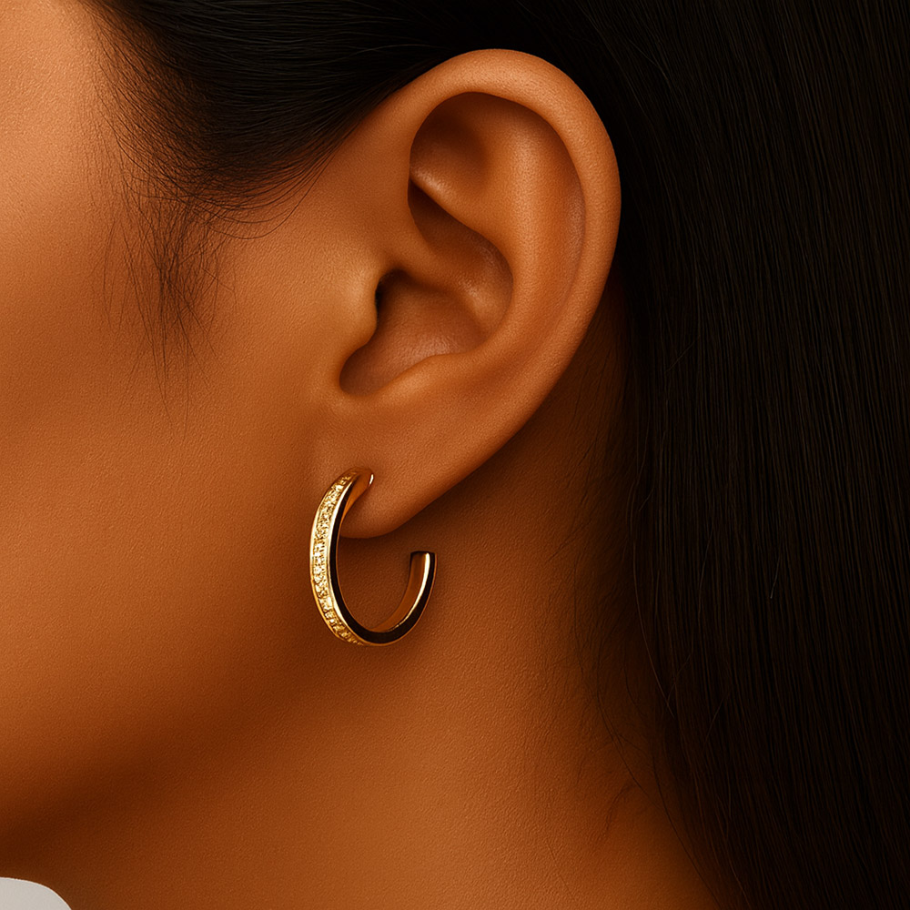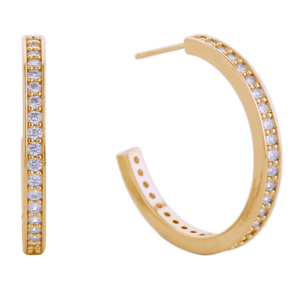Details • Size : 1" X 1" • Post Back • Modern half hoop earrings designed with a clean silhouette and refined shine. Effortlessly versatile, they bring understated elegance to both everyday wear and special occasions, making them a timeless jewelry box essential. • Brass • CZ Cubic Zirconia • Gold Dipped • Hypoallergenic • Lead and Nickel Compliant • Made In Korea