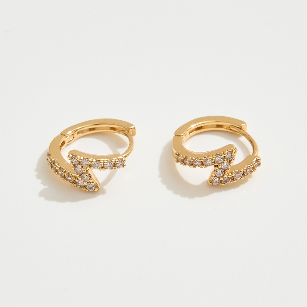 Details • Size : 0.6" X 0.6" X 0.25" • Huggie Back • These V-shaped hoop earrings bring a fresh twist to a classic style, featuring shimmering CZ accents that catch the light beautifully. Perfect for adding a chic, modern touch to both everyday wear and special occasions, they balance elegance with contemporary flair. • Brass • CZ Cubic Zirconia • Gold Dipped • Hypoallergenic • Lead and Nickel Compliant • Made In Korea
