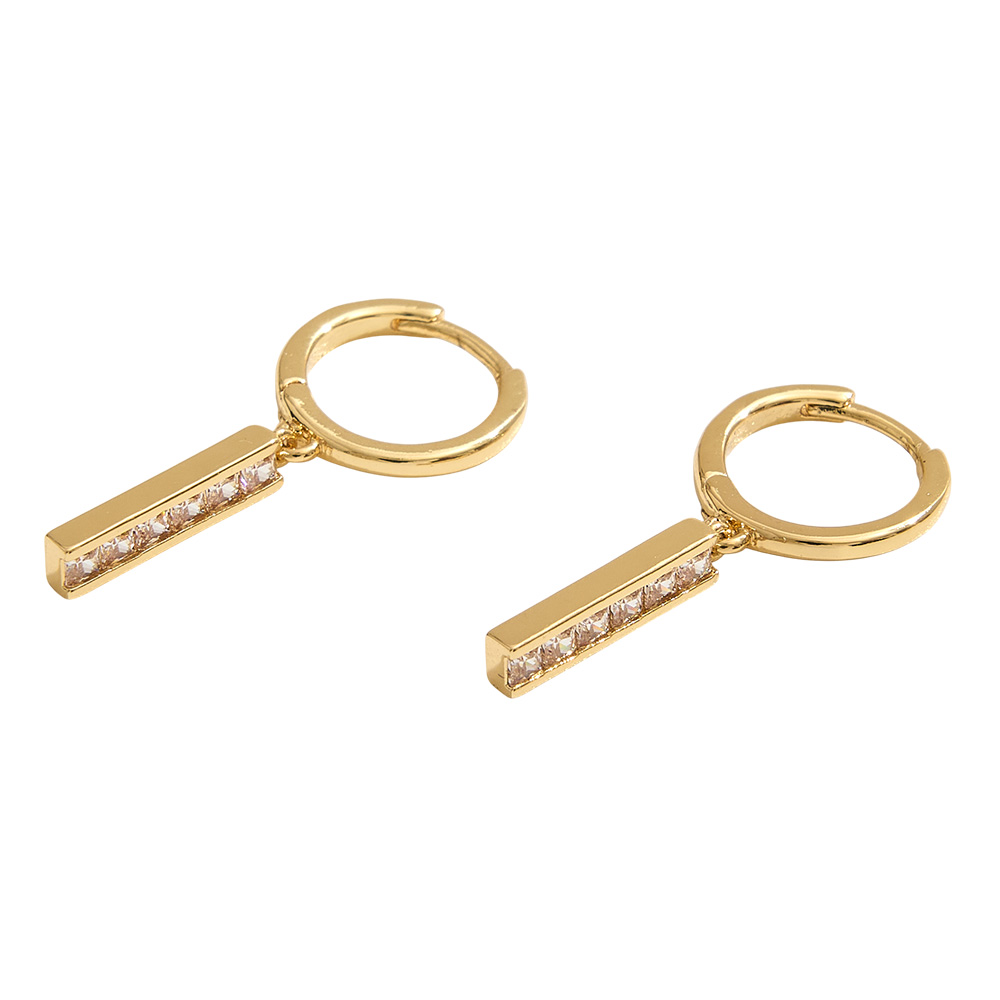 Details • Size : 0.5" X 1.1" • Huggie Back • These chic hoop earrings feature sleek bar-shaped dangles lined with sparkling cubic zirconia stones for a refined, modern look. Lightweight and versatile, they bring a perfect balance of minimalism and elegance, making them a stunning accessory for everyday wear or evening occasions. • Brass • CZ Cubic Zirconia • Gold Dipped • Hypoallergenic • Lead and Nickel Compliant • Made In Korea