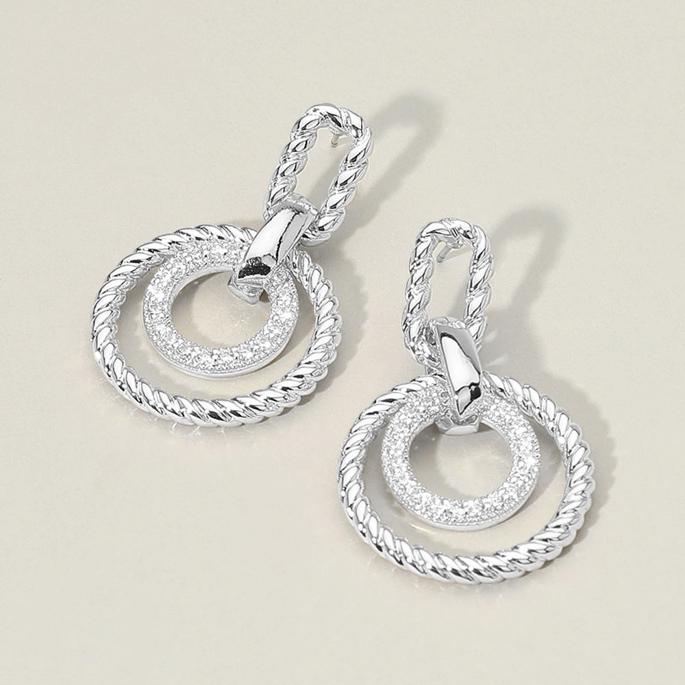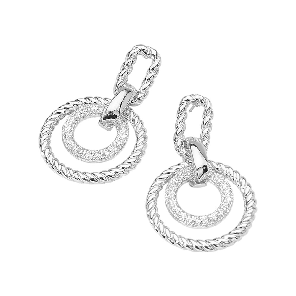 Details • Size : 1" X 1.5" • Post Back • These twisted double circle drop earrings feature an elegant blend of texture and shine. The interlocking rope-inspired design and shimmering inner ring create a sophisticated, modern statement that transitions effortlessly from professional attire to refined evening wear. • CZ Cubic Zirconia • Gold Dipped