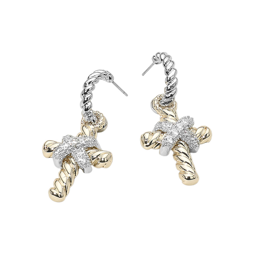 Details • Size : 0.7" X 1.7" • Post Back • Stylish cross drop earrings featuring a twisted rope design with sparkling accents. These statement earrings combine elegance and edge, making them perfect for both casual chic and formal looks, adding a refined and eye-catching touch to your jewelry collection. • Gold Dipped • CZ Cubic Zirconia