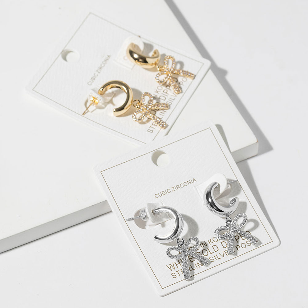 • Stylish crescent hoop earrings finished with a sparkling CZ bow charm that adds graceful movement and feminine appeal. This elegant drop design blends playful detail with a polished silhouette, making it ideal for everyday styling, gifting, and boutique jewelry collections seeking timeless yet trendy accents.