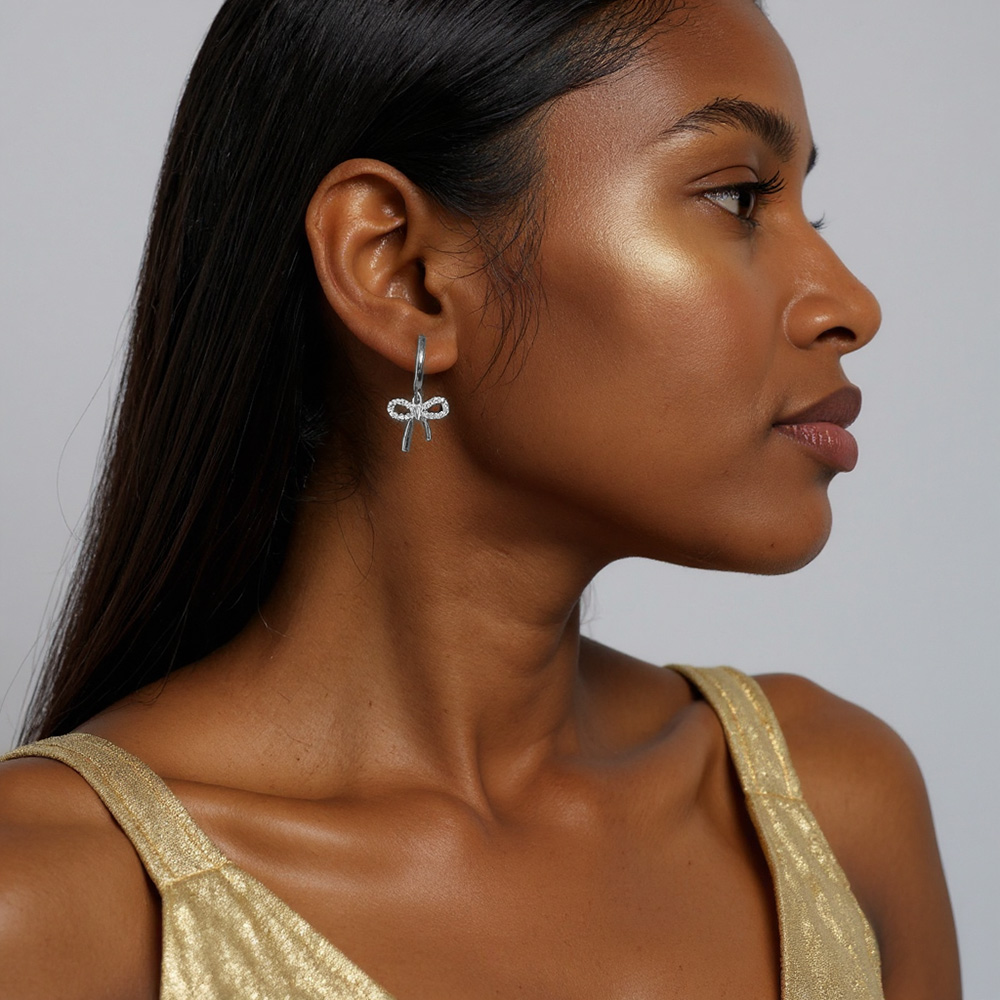 Details • Size : 0.5" X 0.9" • Huggie Back • These dainty hoop earrings feature sparkling CZ-studded bow charms that add a playful, feminine touch. Perfect for day-to-night wear, their chic design blends timeless elegance with whimsical detail, making them a versatile statement in any jewelry collection. • Brass • CZ Cubic Zirconia • Gold Dipped • Hypoallergenic • Lead and Nickel Compliant • Made In Korea