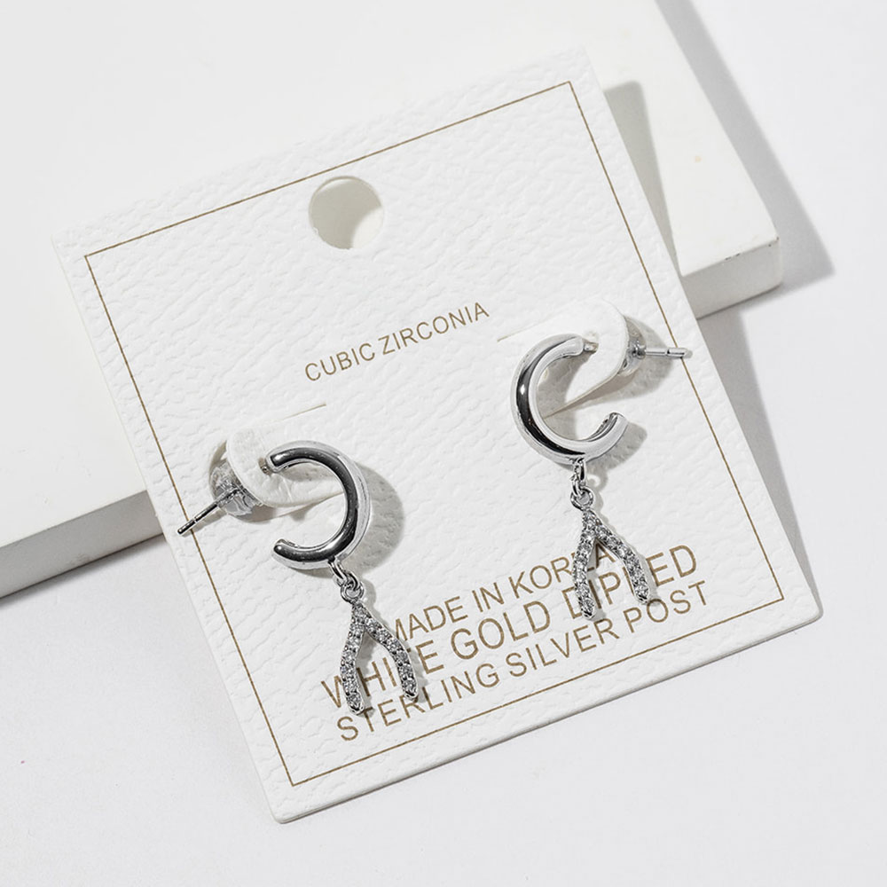 Details • Size : 0.5" X 1" • Modern crescent hoop drop earrings featuring a sleek curved hoop paired with a sparkling CZ-style wishbone accent. Designed for everyday wear or elevated styling, these earrings offer subtle shine, graceful movement, and a versatile silhouette ideal for boutiques and curated accessory collections. • CZ Cubic Zirconia • Gold Dipped • Lead and Nickel Compliant • Made In Korea • Sterling Silver Post