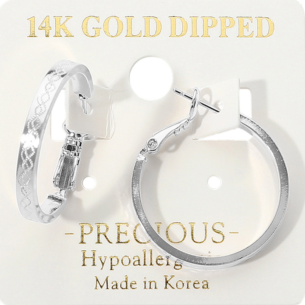 Details • Size : 1" X 1" • Omega Back • Stylish hoop earrings featuring a delicate engraved design that adds subtle elegance. Lightweight and comfortable for daily wear, these versatile hoops complement both casual and formal outfits, making them an essential addition to any jewelry collection. • Lead and Nickel Compliant • Hypoallergenic • Made In Korea • Gold Dipped