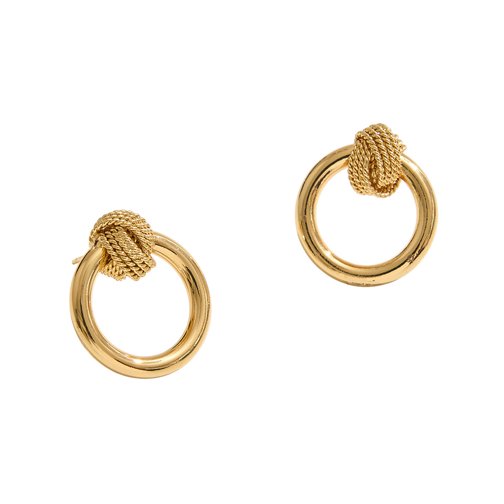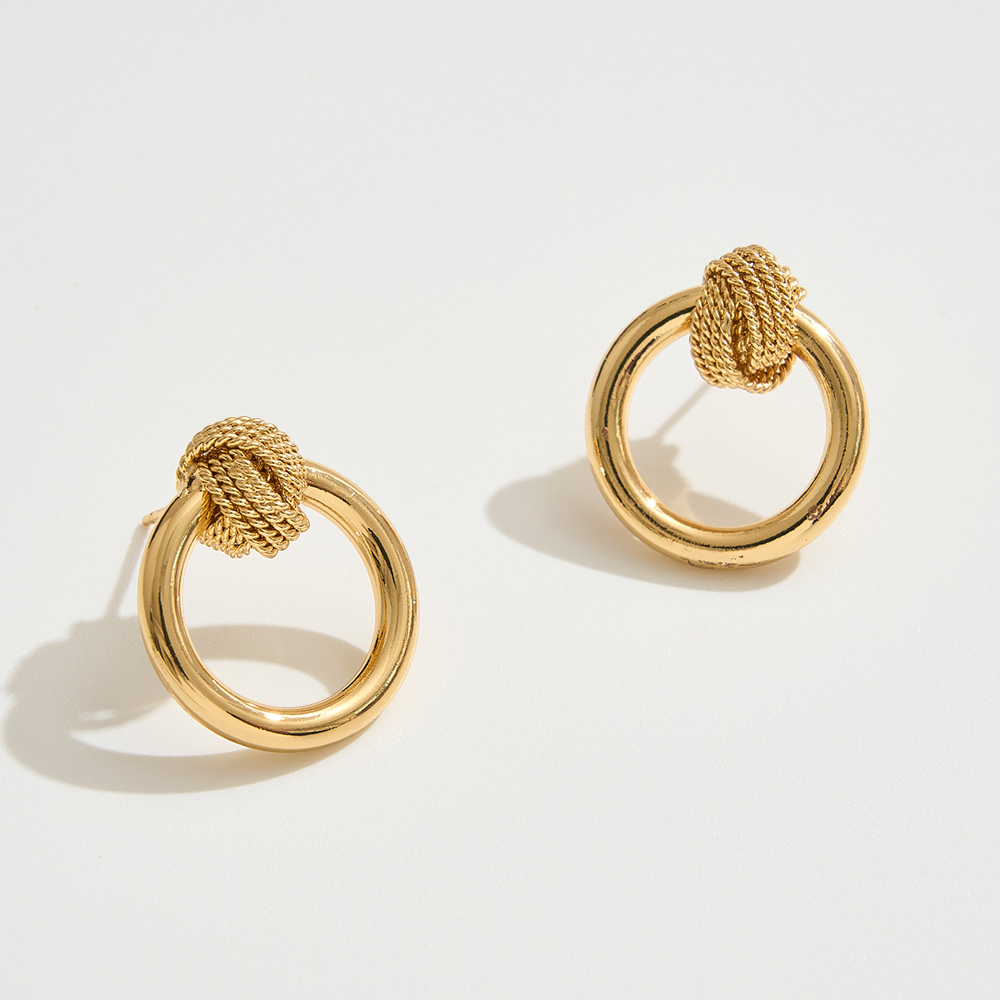 Details • Size : 0.7" X 0.75" • Post Back • These chic knot and hoop earrings showcase a textured knot detail paired with a smooth circular hoop, creating a stylish balance of boldness and elegance. Ideal for both casual and dressy outfits, they add a modern yet timeless accent to your jewelry collection. • Brass • Gold Dipped • Hypoallergenic • Lead and Nickel Compliant • Made In Korea