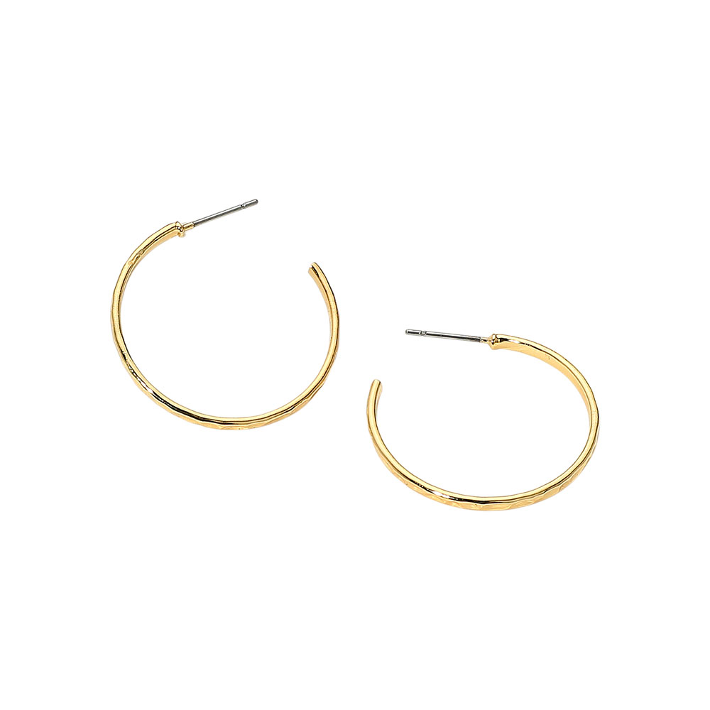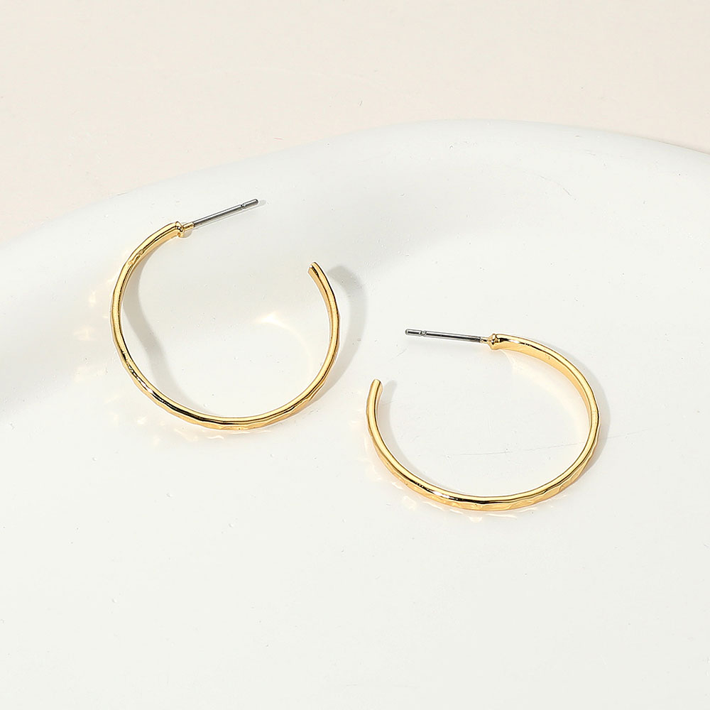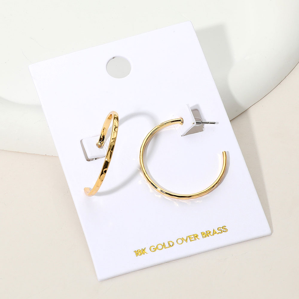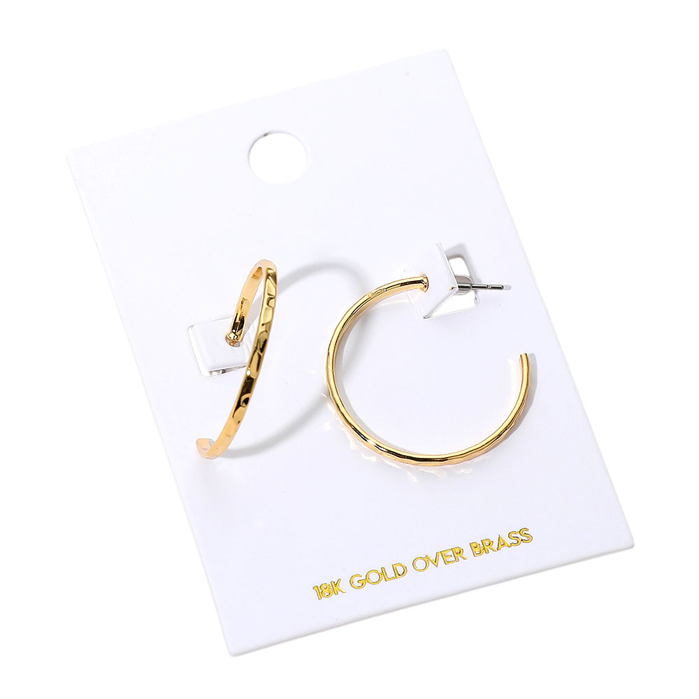 Details • Size : 1.1" X 1.1" • Post Back • Stylish open hoop earrings featuring one hammered and one smooth design for a unique, mismatched look. Lightweight and versatile, perfect for adding a modern twist to casual or dressy outfits. • Brass • Gold Dipped • Lead and Nickel Compliant