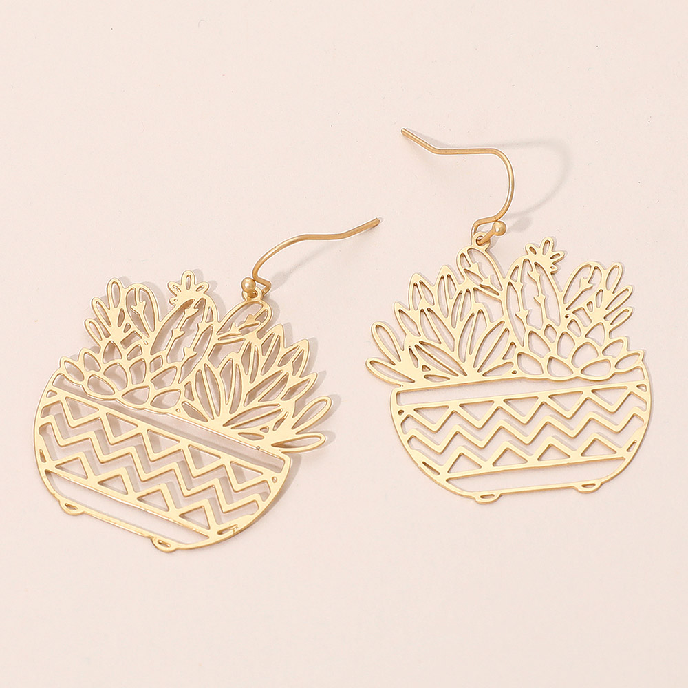 Brass Metal Botanical Planter Cutout Dangle Earrings