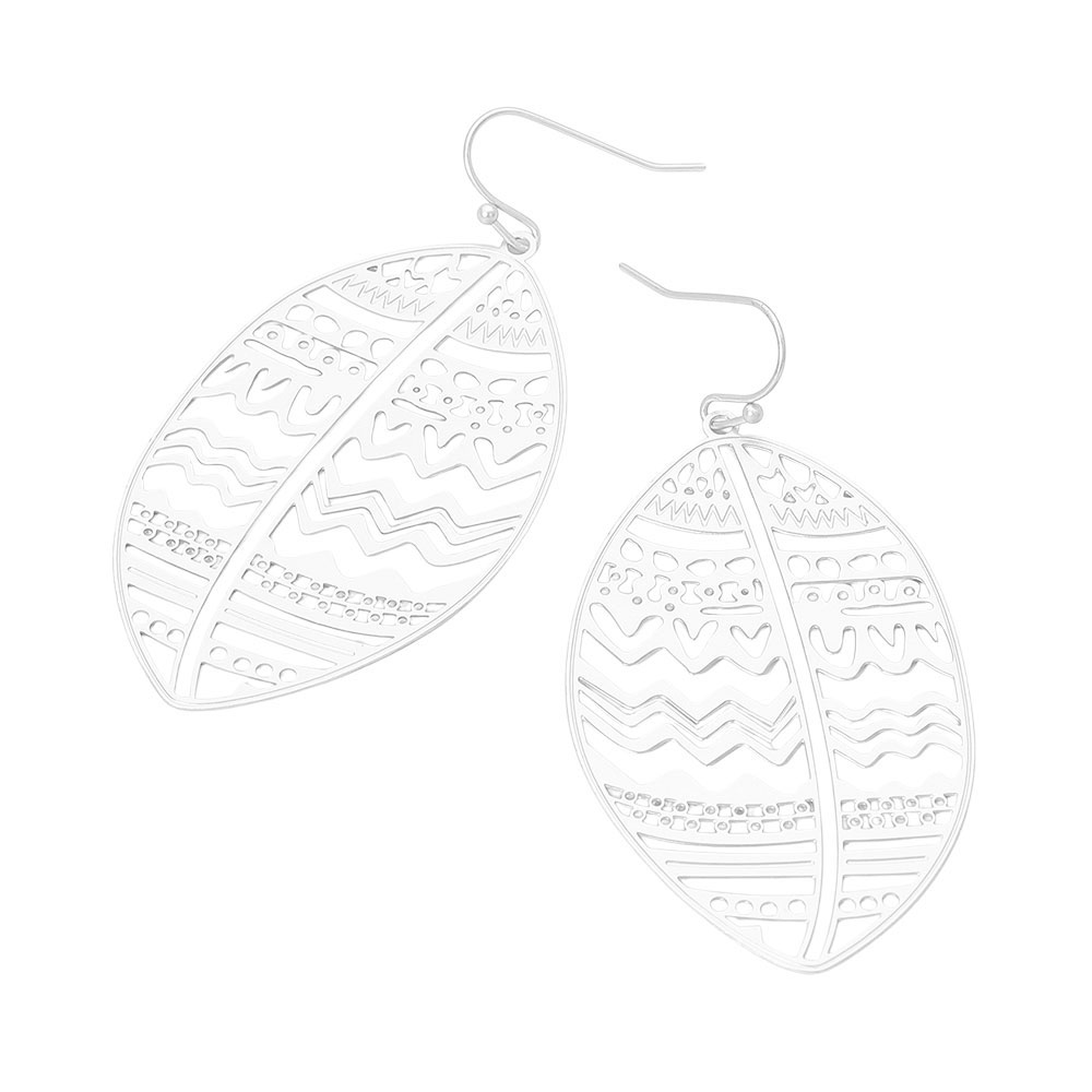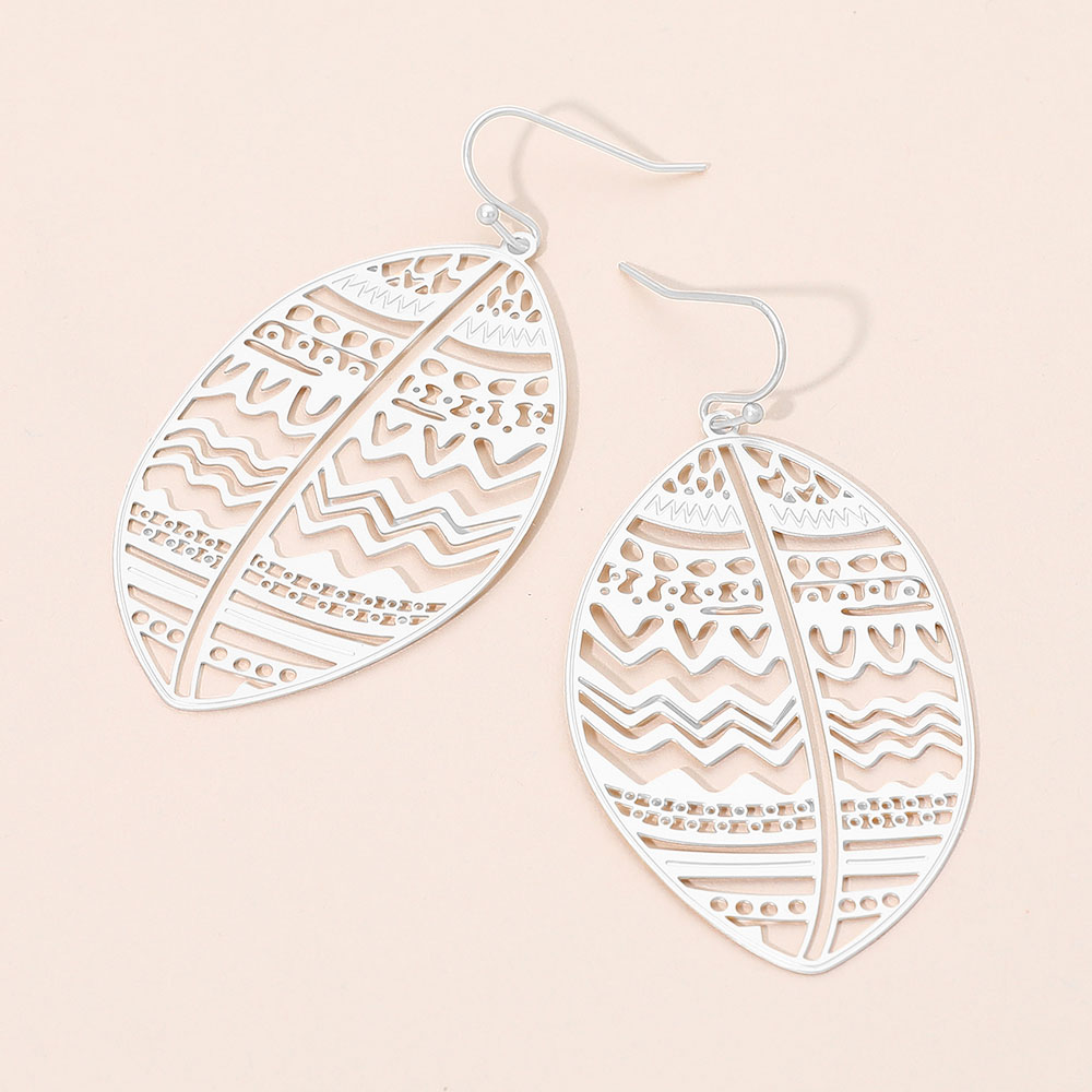Details • Size : 1.25" X 2.5" • Fish Hook Back • Make a bold statement with these tribal pattern leaf cutout earrings. Featuring intricate geometric detailing and a lightweight design, they bring an artistic and contemporary edge to your style. Perfect for expressing individuality and adding flair to any casual or chic outfit. • Brass • Lead and Nickel Compliant
