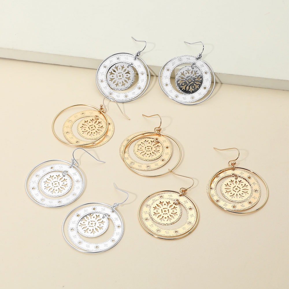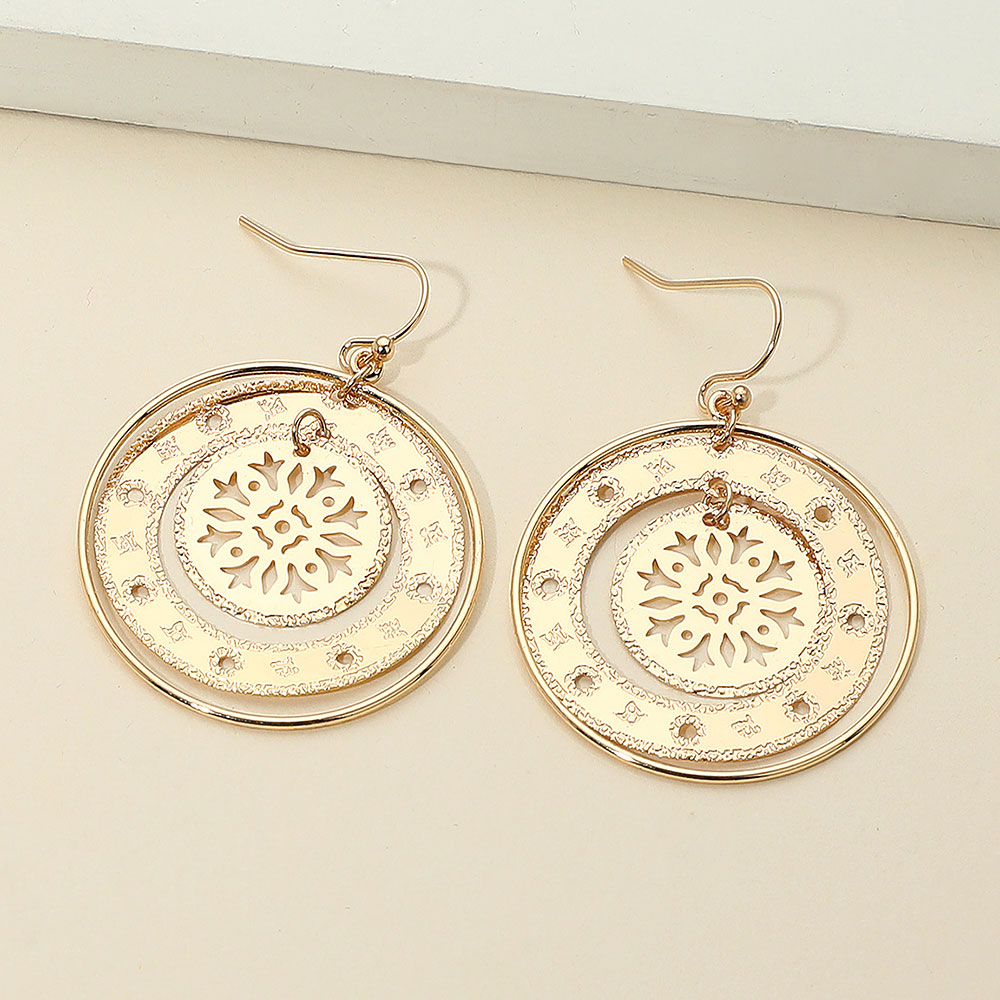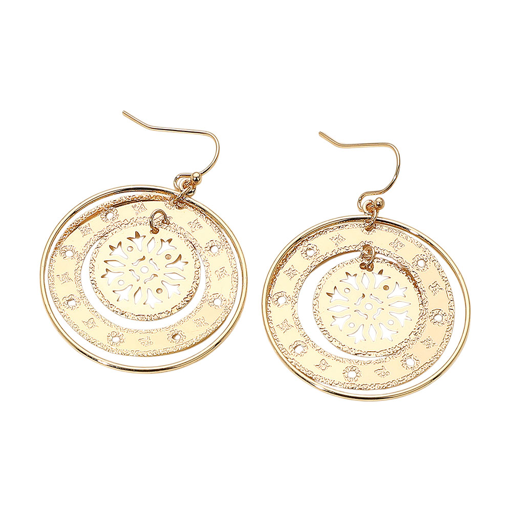 Details • Size : 1.5" X 2" • Fish Hook Back • Chic medallion drop earrings featuring an intricate cutout design with layered circular accents. Lightweight and versatile, these earrings bring a touch of detail and shine to everyday and occasion wear. • Lead and Nickel Compliant