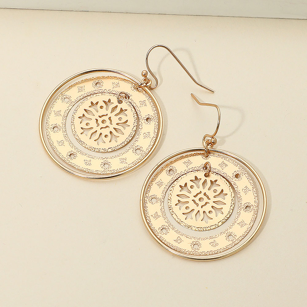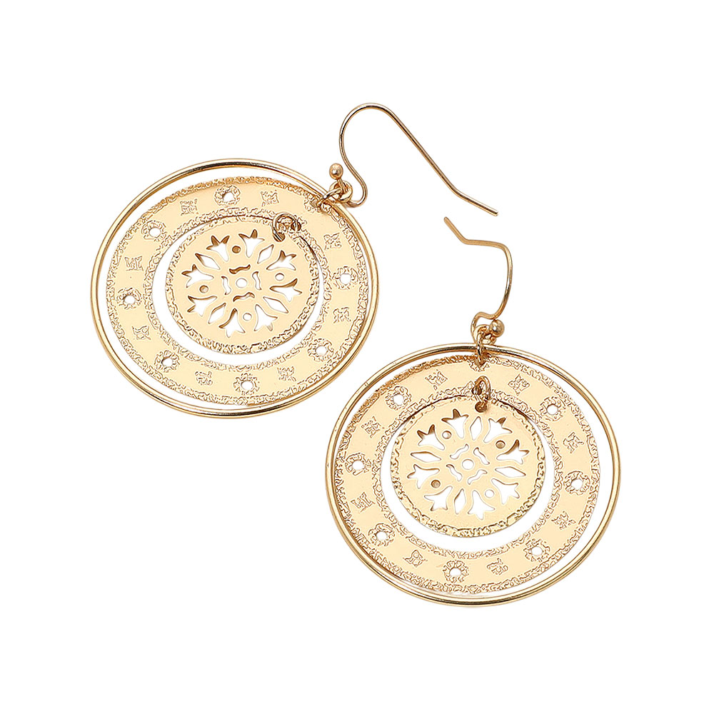 • Chic medallion drop earrings featuring an intricate cutout design with layered circular accents. Lightweight and versatile, these earrings bring a touch of detail and shine to everyday and occasion wear.