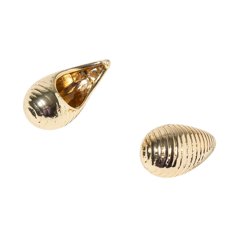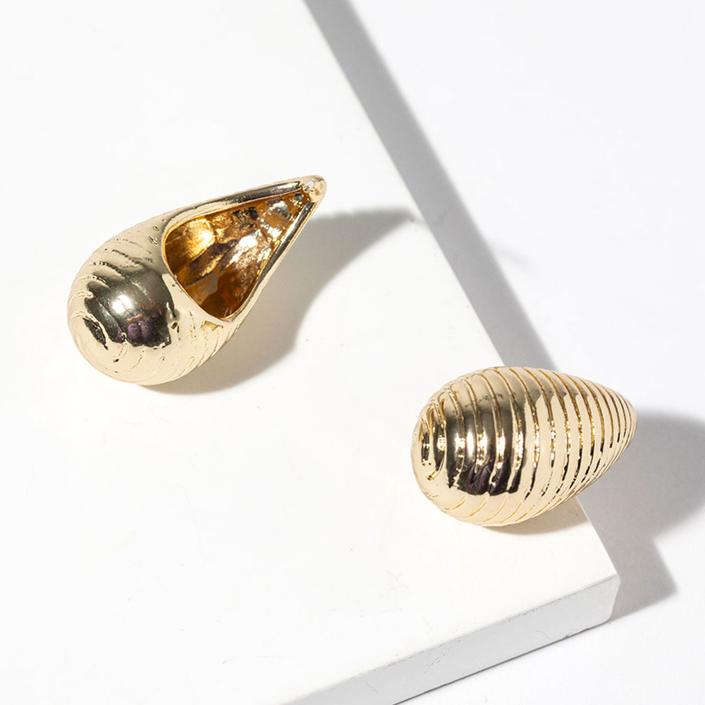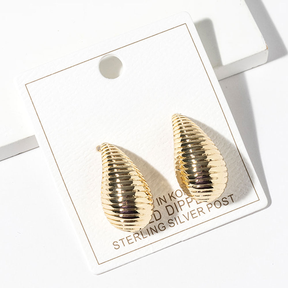 Details • Size : 0.6" X 1.2" • Modern teardrop stud earrings featuring a sculpted ribbed texture for a sleek, dimensional look. Designed to reflect light beautifully, these studs offer a refined statement that transitions effortlessly from everyday wear to evening styling, making them a versatile addition to any accessory collection. • Gold Dipped • Lead and Nickel Compliant • Made In Korea • Sterling Silver Post