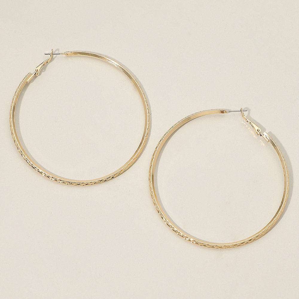 Details • Size : 2.75" X 2.75" • Omega Back • Large hoop earrings with a slim, textured round design that catches the light from every angle. Lightweight and comfortable for all-day wear, featuring secure latch backs for an effortless statement with casual or dressy outfits. • Lead and Nickel Compliant • Gold Dipped