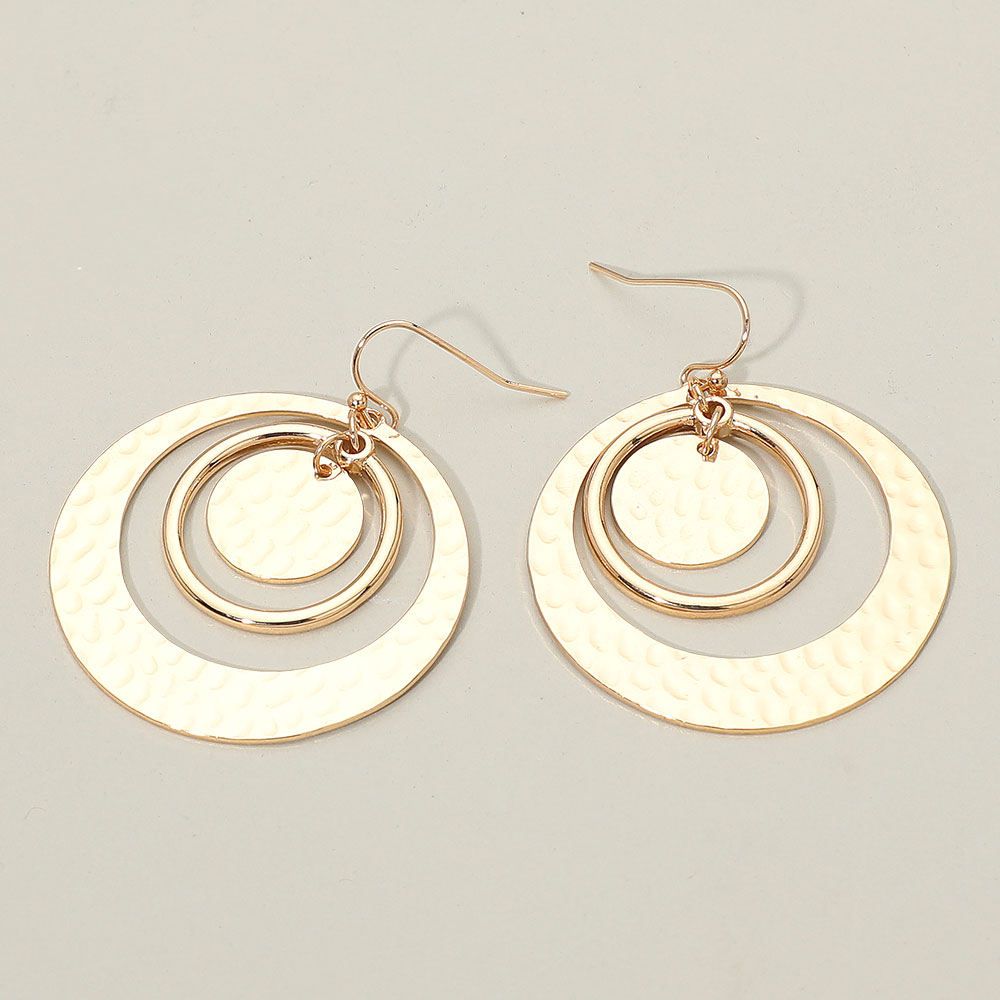 • Add a modern touch to your look with these textured triple circle dangle earrings. Featuring layered open rings with a lightly hammered finish, they catch the light beautifully for an elegant yet contemporary style. Perfect for elevating both casual and dressy ensembles.