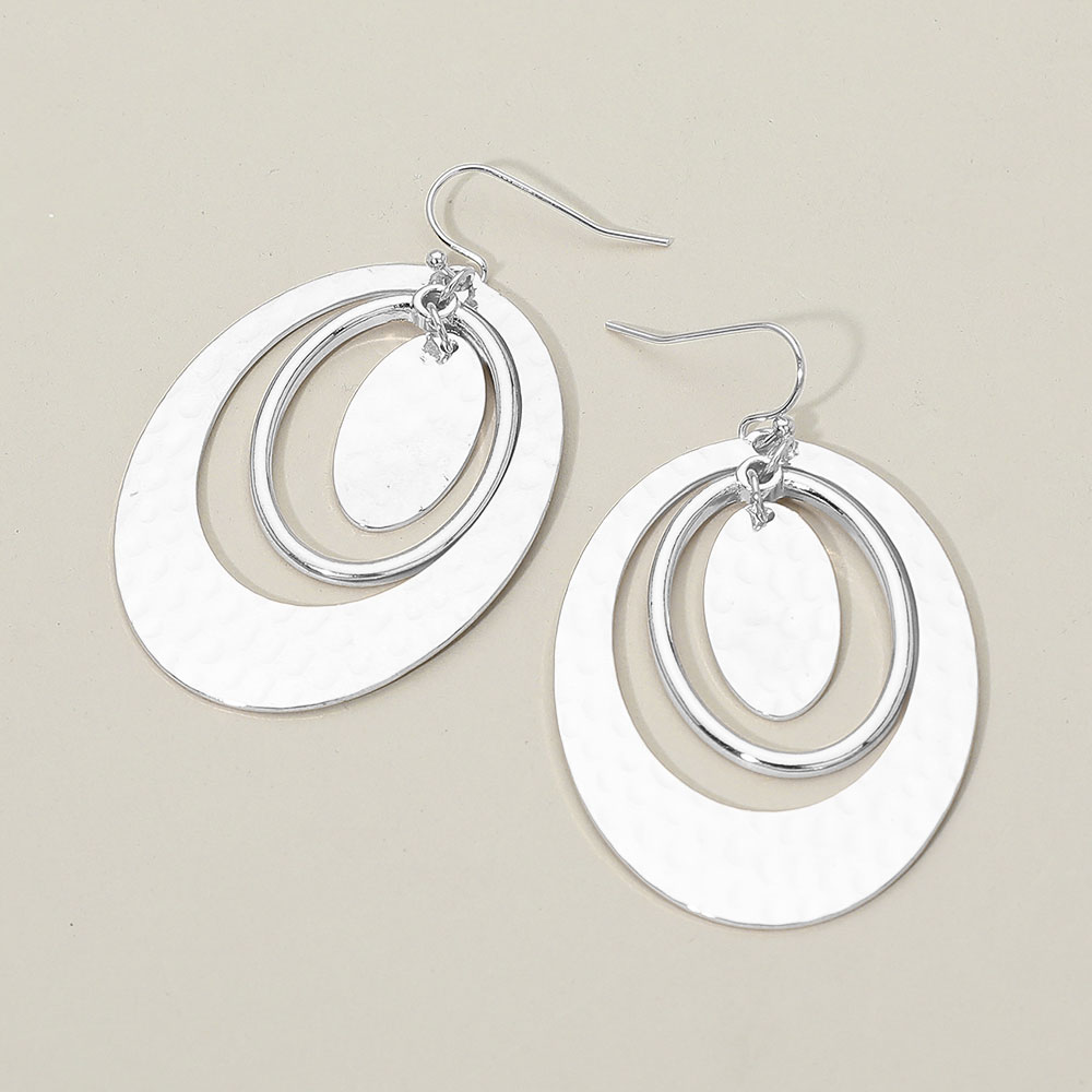 • Elevate your accessory game with these textured oval layered dangle earrings. Featuring interlocking open ovals with a subtle hammered finish, they blend modern sophistication with timeless elegance. Perfect for adding movement and shine to both casual and dressy looks.