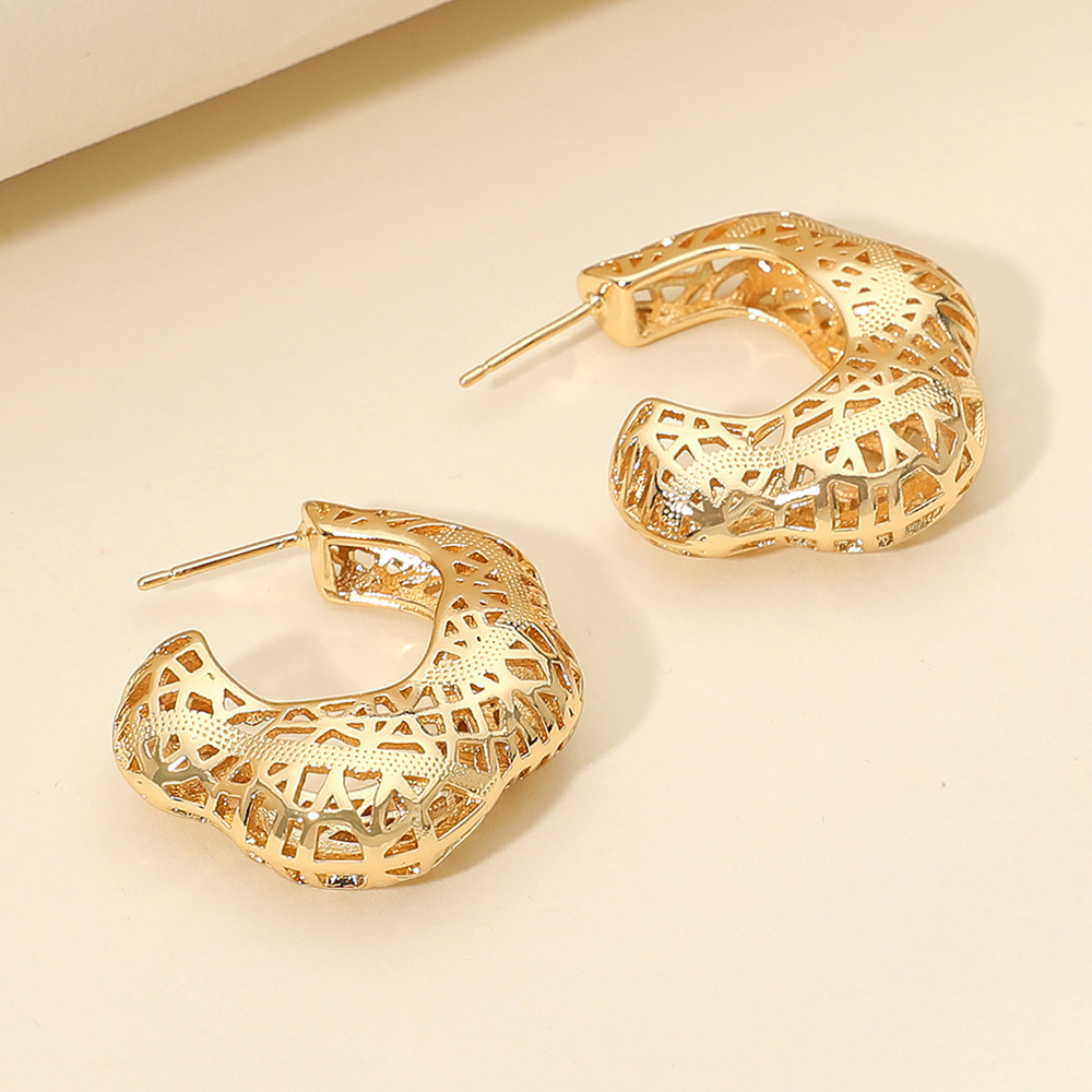 Details • Size : 1.4" X 1.25" • Post Back • Make a bold statement with these cutout chunky hoop earrings. Designed with a stylish hollow pattern and textured shine, these trendy statement hoops are perfect for elevating everyday looks or adding glam to evening outfits. • Lead and Nickel Compliant