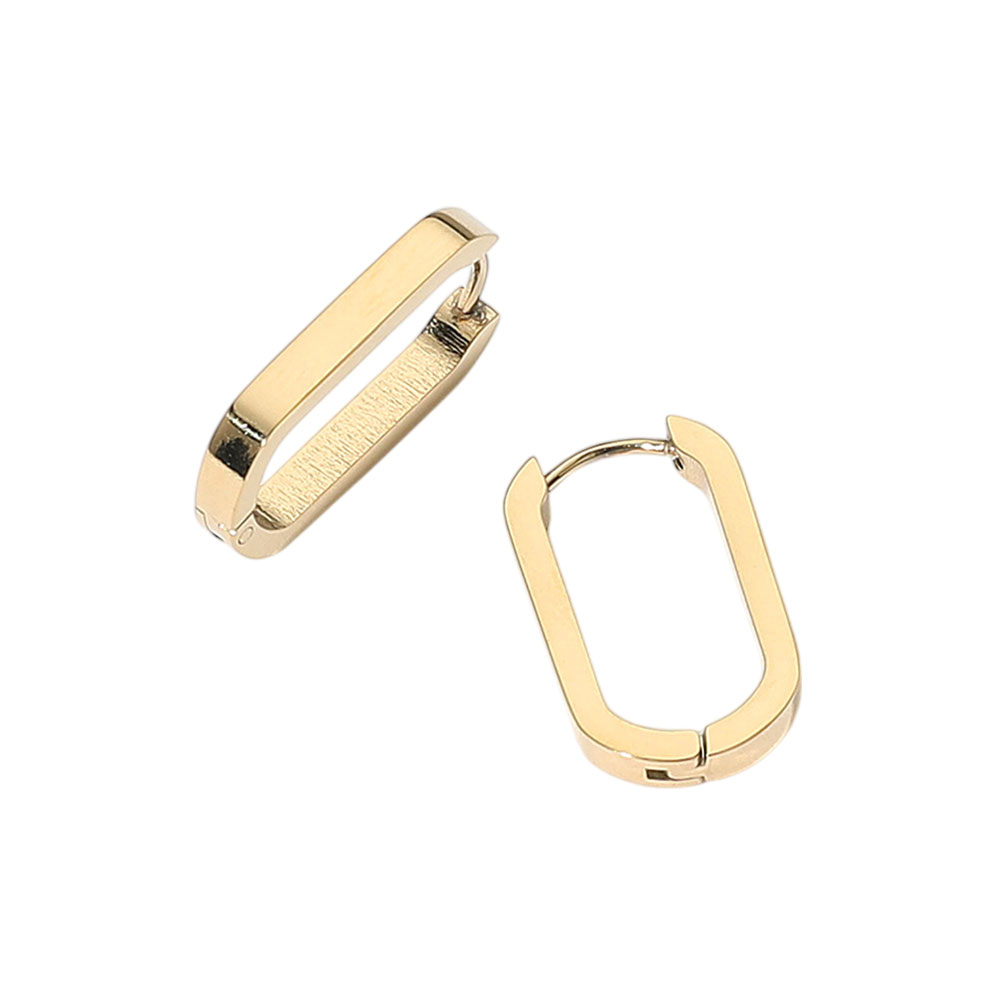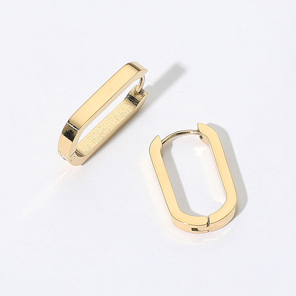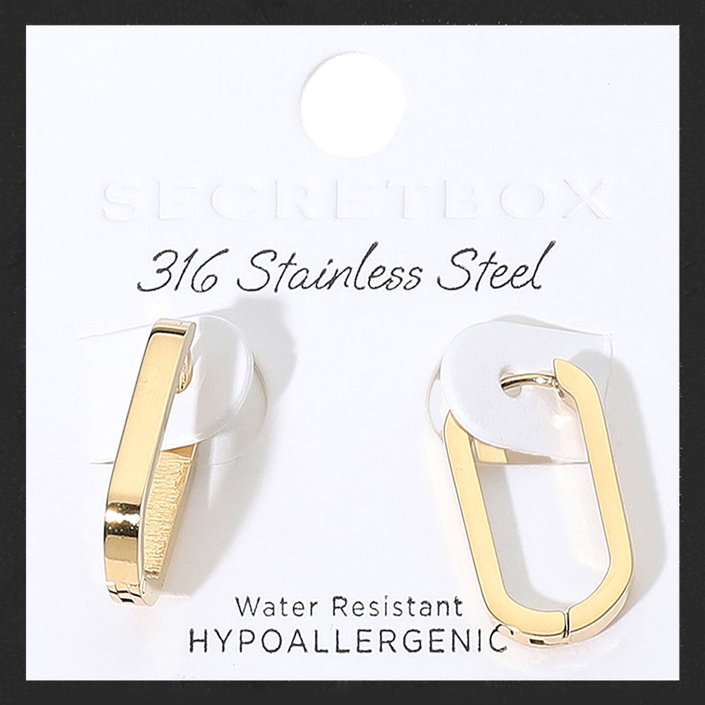 Details • Size : 0.5" X 0.8" • Huggie Back • Water Resistant • Streamlined rectangular huggie earrings deliver a fresh twist on a classic hoop silhouette. Compact, lightweight, and easy to style, they provide polished everyday wear that transitions smoothly from casual looks to evening outfits, perfect worn solo or layered for subtle statement appeal. • Hypoallergenic • Stainless Steel