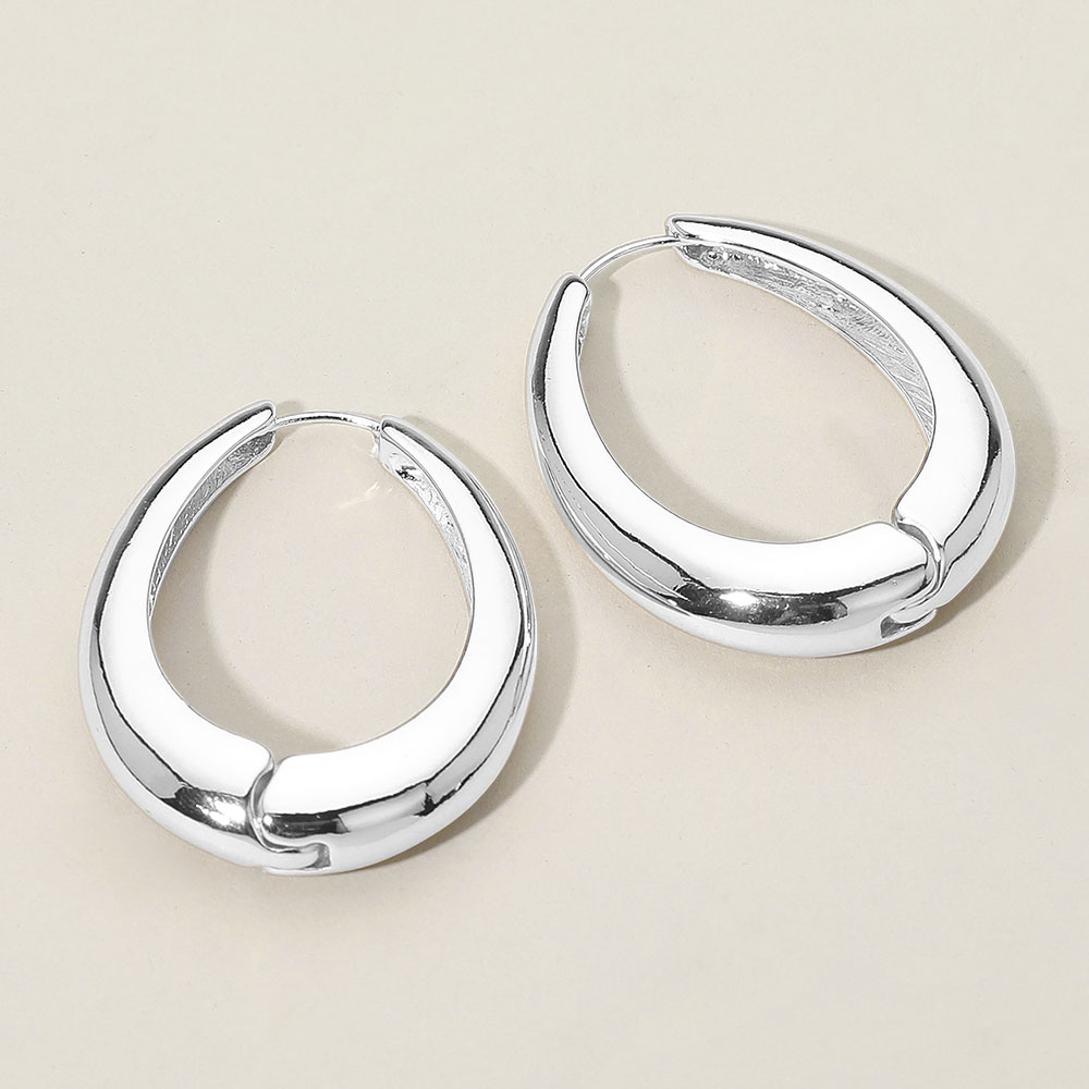 Details • Size : 1.25" X 1.8" • Huggie Back • Stylish chunky oval hoop earrings featuring a bold rounded silhouette perfect for everyday wear or dressing up. Lightweight, easy to fasten, and designed for a modern, polished look. A versatile accessory that adds effortless style to any outfit. • Sterling Silver Dipped • Lead and Nickel Compliant
