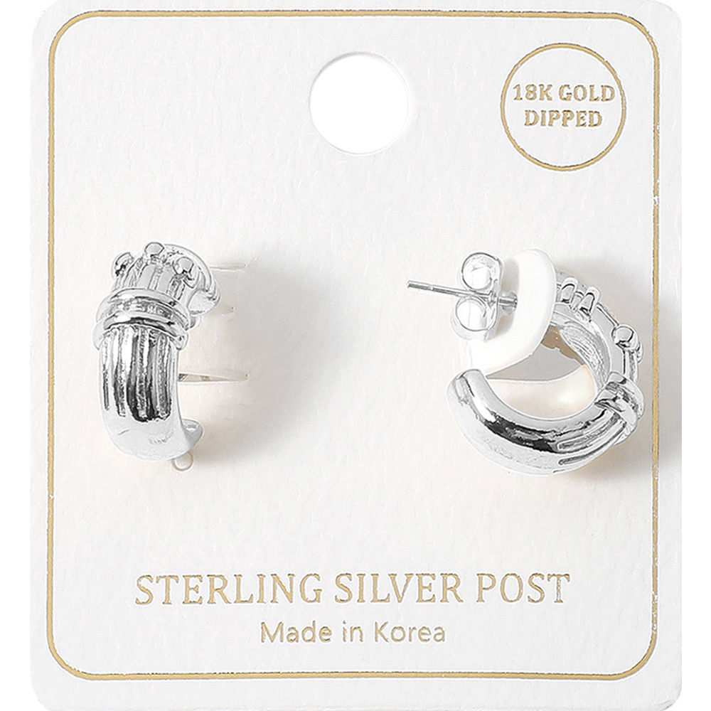 Details • Size : 0.6" X 0.6" X 0.3" • Stylish textured mini hoop earrings featuring an intricate ridged design and a comfortable sterling silver post. Lightweight and perfect for daily wear or dressing up any outfit, these hoops add a chic touch to any jewelry collection. Ideal gift choice for effortless elegance. • Lead and Nickel Compliant • Made In Korea • Sterling Silver Post • Sterling Silver Dipped