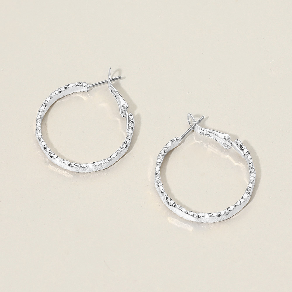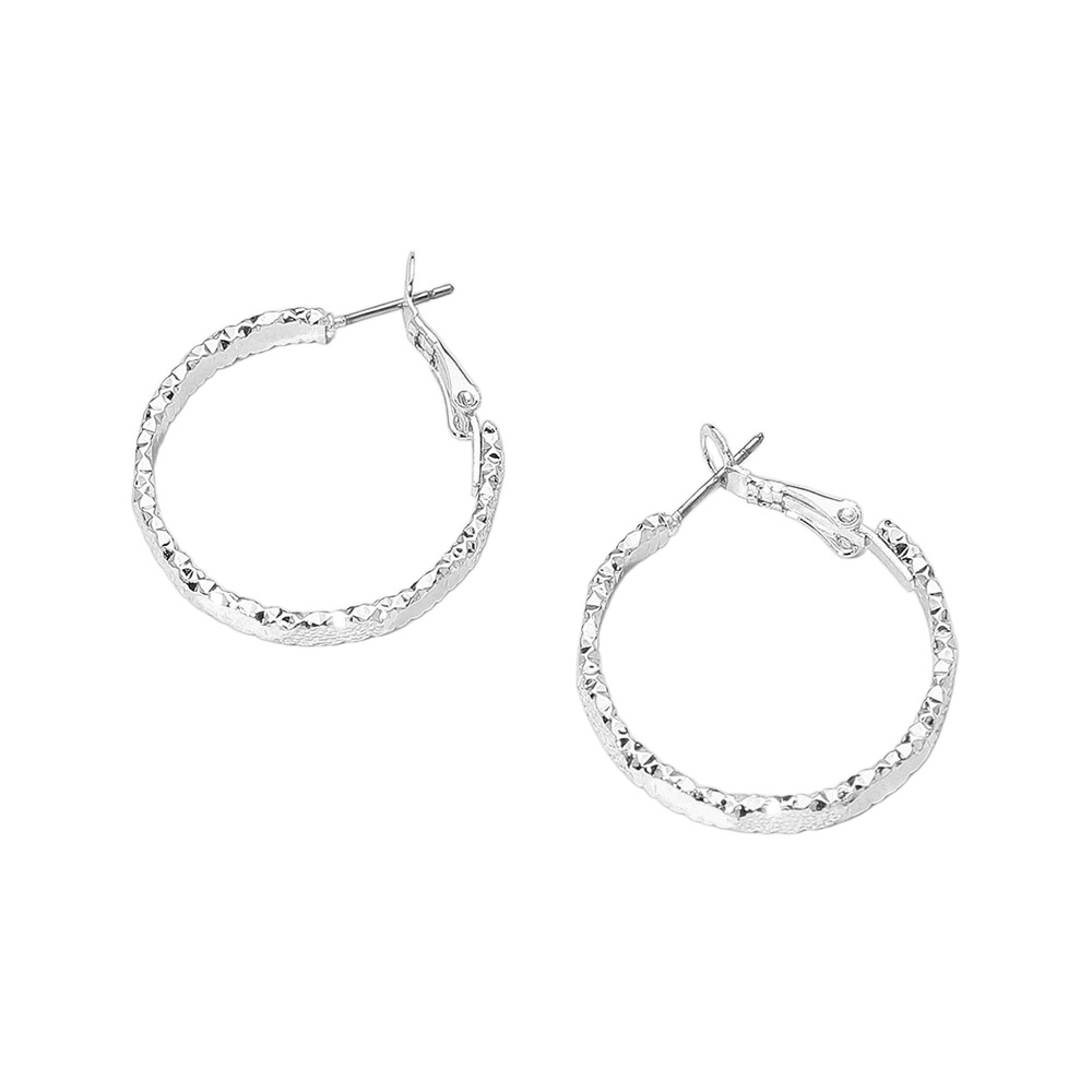 Details • Size : 1.2" X 1.2" • Omega Back • Small textured hoop earrings featuring a faceted pattern that adds shine and dimension. Lightweight and comfortable with a secure latch-back closure, perfect for everyday wear or adding subtle sparkle to any look. • Sterling Silver Dipped • Lead and Nickel Compliant