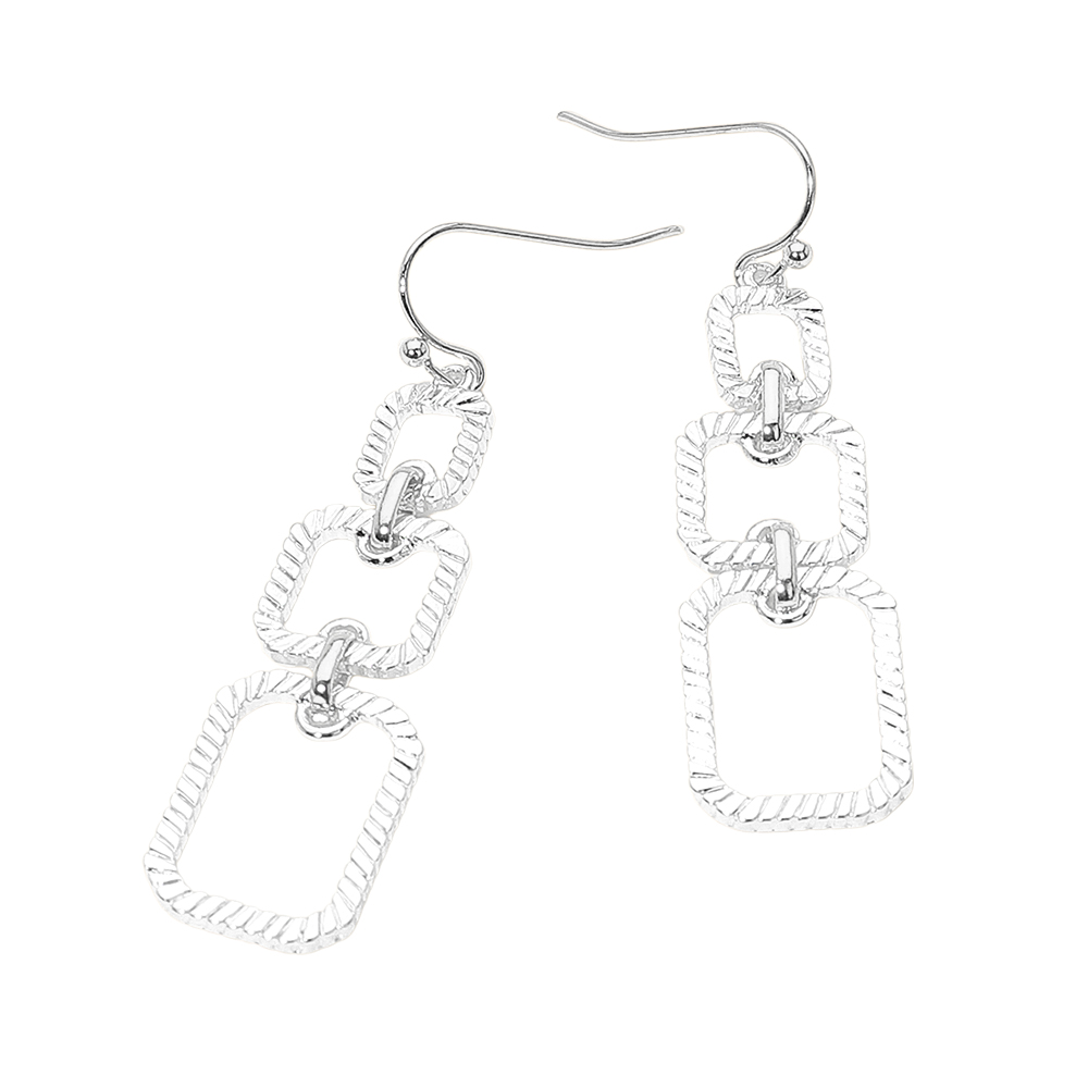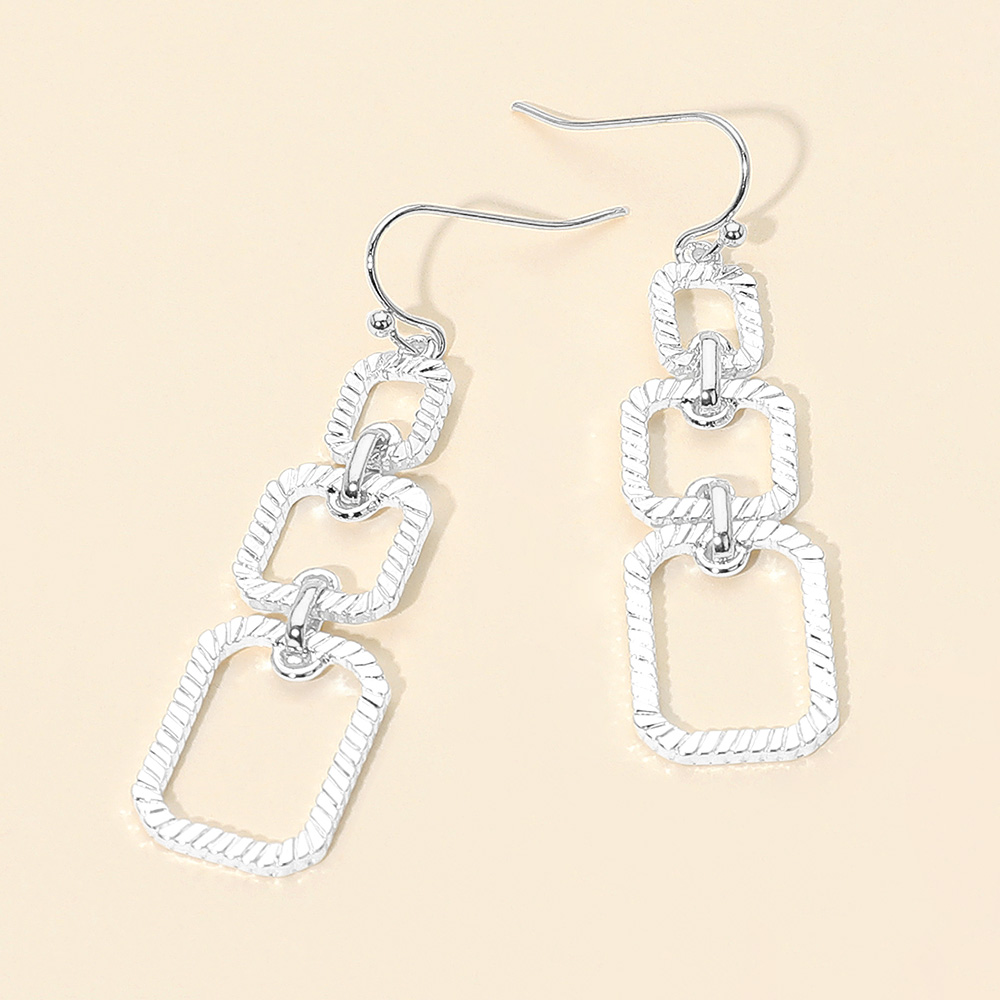 Details • Size : 0.6" X 2.25" • Fish Hook Back • Modern geometric link drop earrings designed with textured open shapes that create eye-catching movement. Their bold yet refined structure adds a stylish accent to any outfit, making them a versatile accessory for both everyday wear and elevated occasions. • Lead and Nickel Compliant