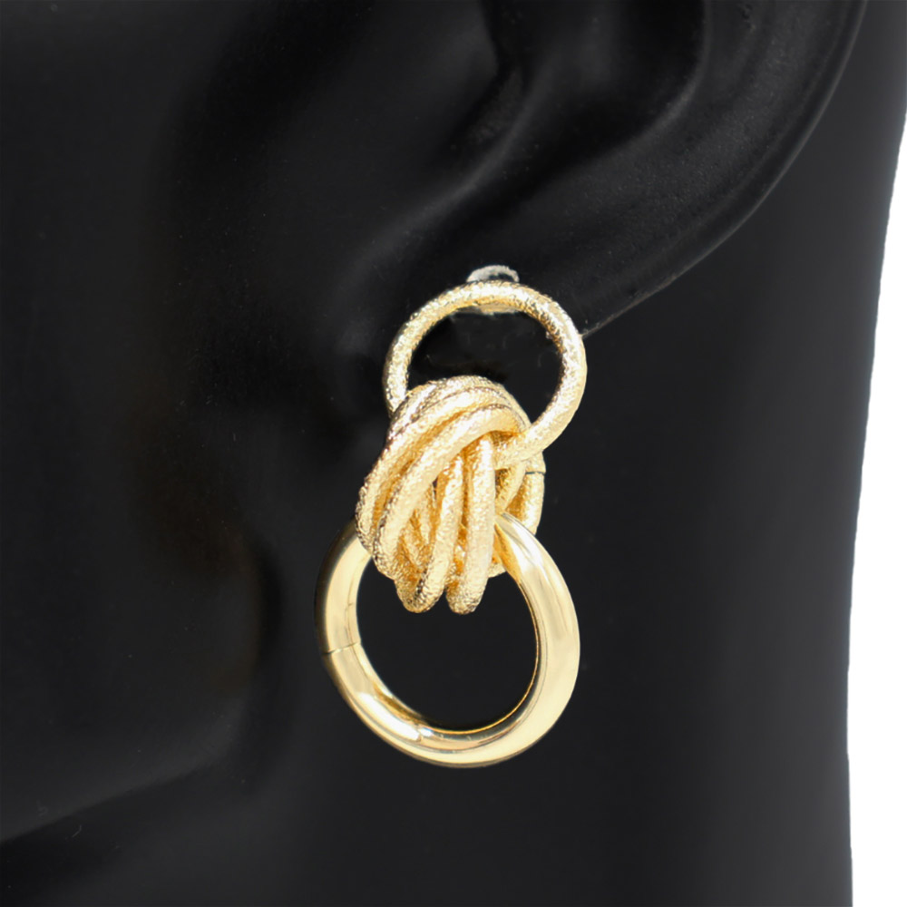 • Bold statement earrings featuring a textured loop, intricate knot detail, and a smooth open hoop for a modern layered look. Lightweight yet eye-catching, perfect for elevating everyday outfits or adding a stylish accent to evening and special-occasion ensembles.