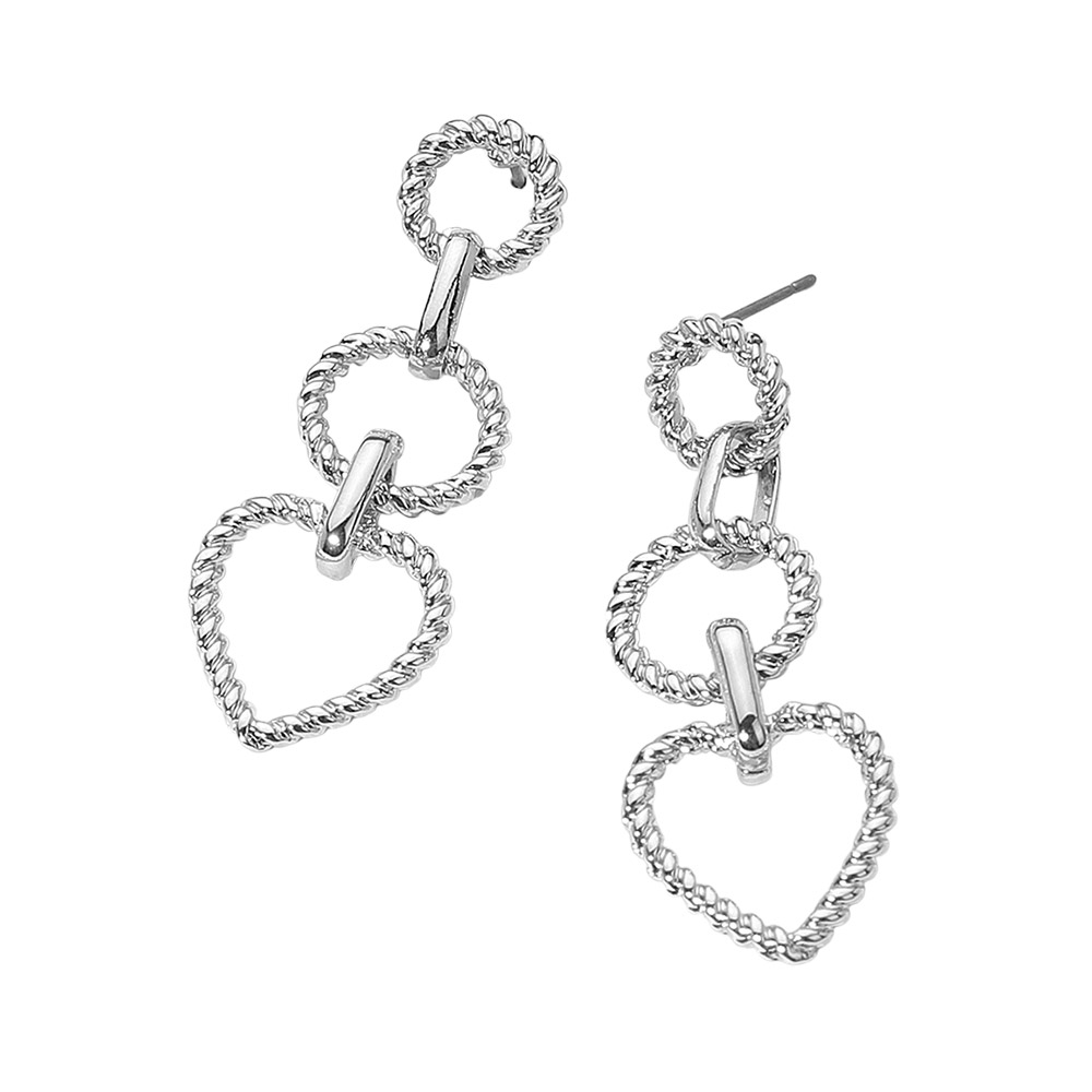 Details • Size : 0.6" X 1.75" • Post Back • Make a chic statement with these twisted heart drop earrings featuring interlinked circles and heart outlines for a refined, modern look. Lightweight and eye-catching, they bring a touch of romance and sophistication to both casual and evening ensembles. • Lead and Nickel Compliant
